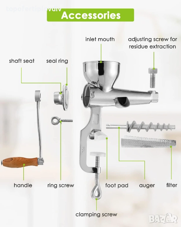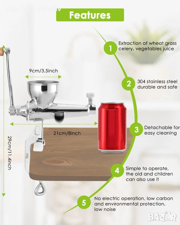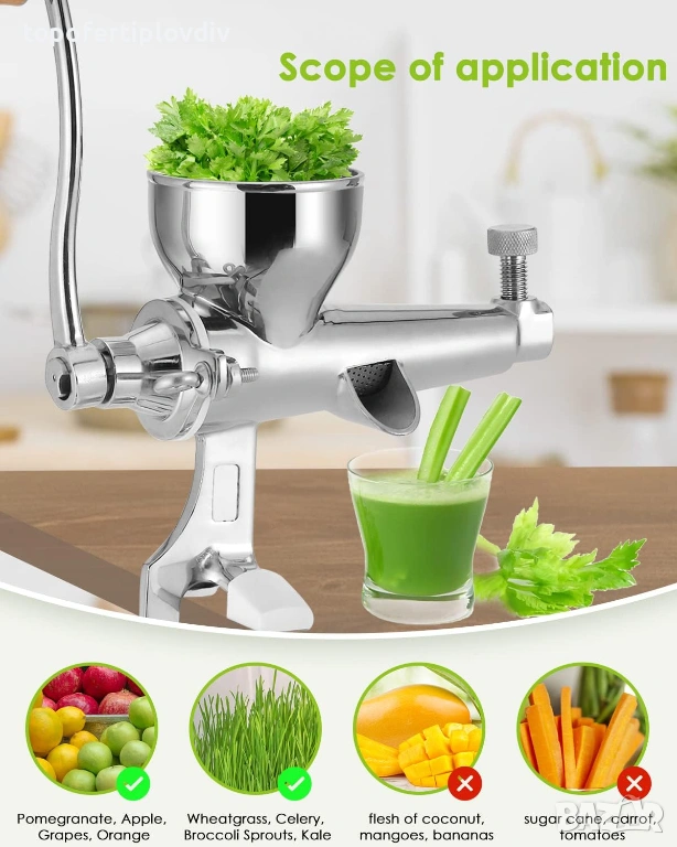 Ръчна многофункционална сокоизстисквачка – подходяща за изцеждане на пшенична трева, целина, кълнове от броколи, къдраво зеле, спанак, магданоз, нар, ябълка, грозде, портокал и други плодове/зеленчуци. (Не се препоръчва изстискване на твърде мека пулпа, като например пулпа от кокосови орехи, домати, манго, банани. А захарна тръстика/моркови не могат да бъдат изцедени.)