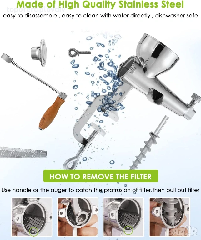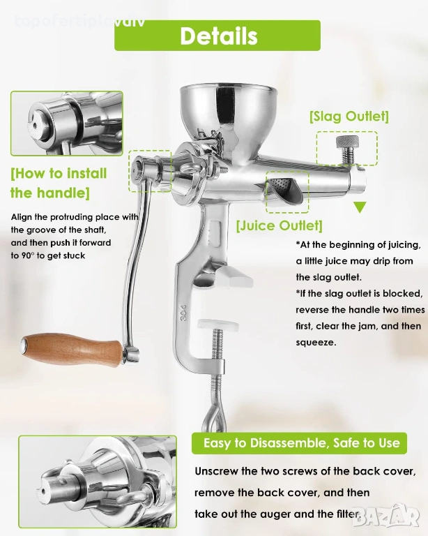 Корпус от неръждаема стомана 304# – Нашата ръчна сокоизстисквачка е изработена чрез процес на леене, здрава и издръжлива е, с полирана повърхност и неполирана вътрешност. Моля, почиствайте остатъците в изхода за шлака навреме. Не затягайте винта на предния изход за шлака твърде силно, просто го разхлабете леко, за да може шлаката да се изхвърли лесно. В противен случай сокът ще изтече леко отзад.