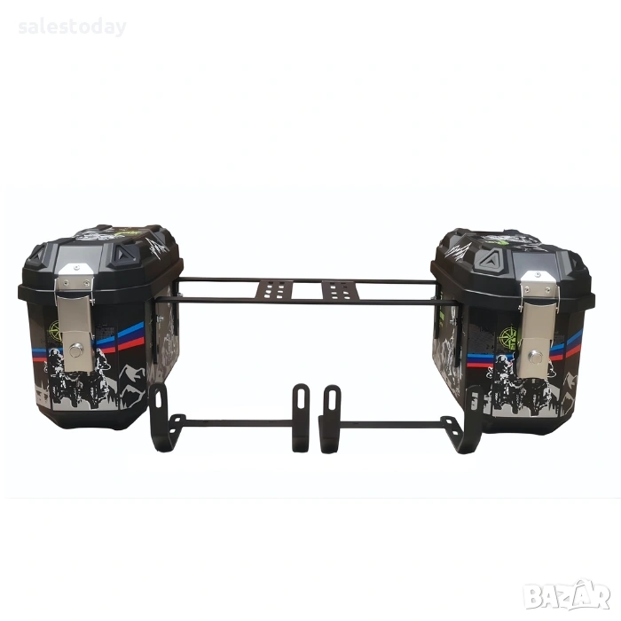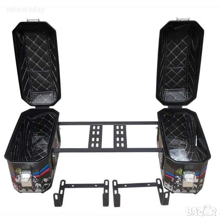 Комплектът включва стабилна метална рамка и всички необходими крепежни елементи за бърз и лесен монтаж към мотоциклета. Заключващият механизъм осигурява допълнителна сигурност, а удобните дръжки позволяват лесно пренасяне.