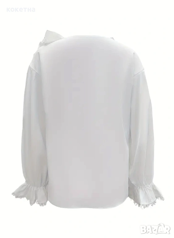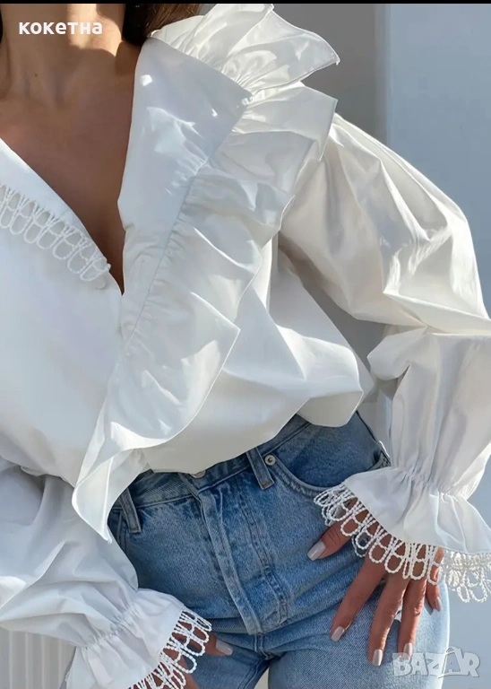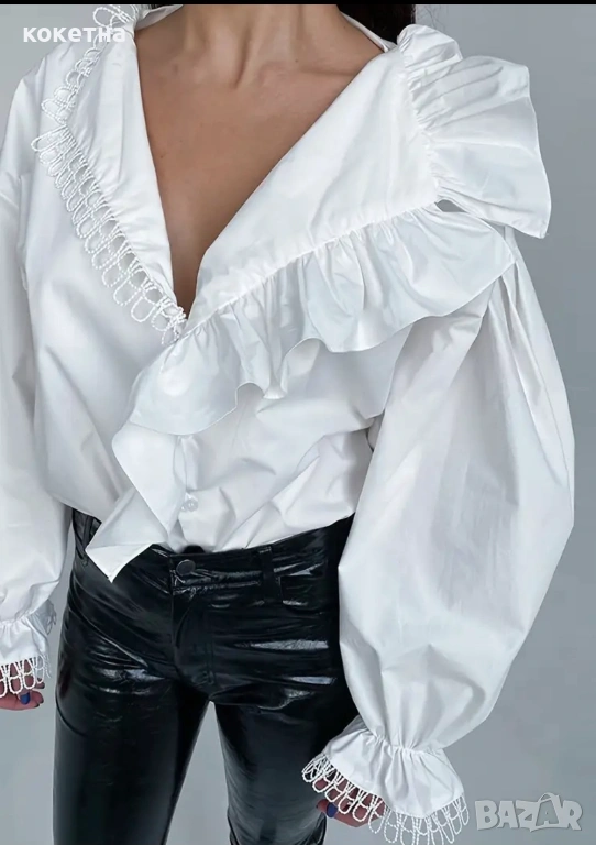 Бяла дамска риза в страхотна кройка. Ризата е с голяма яка с къдрици и дантела. По етикет е XL, но определено би станала и за XXL. Само изпрана, не е носена.