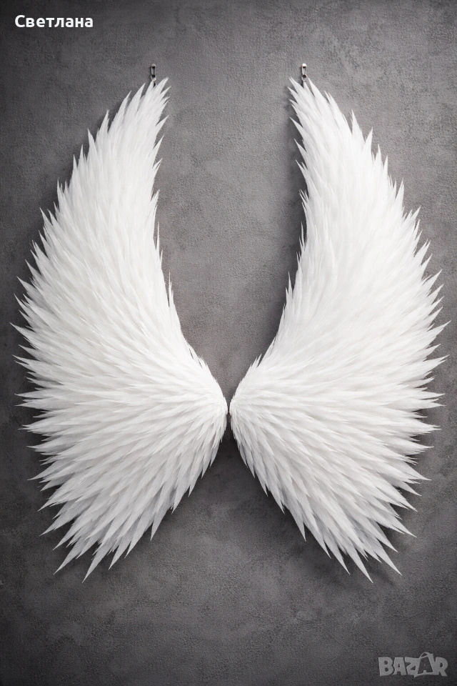 Красиви бели ангелски крила, идеални за декорация. Изработени от меки и нежни пера, които създават впечатляващ визуален ефект. Тези крила могат да бъдат използвани за украса на дома, за фотосесии или за други творчески цели. Цената е за ангелски крила с размер 90 см. Възможност за изработка във всеки размер