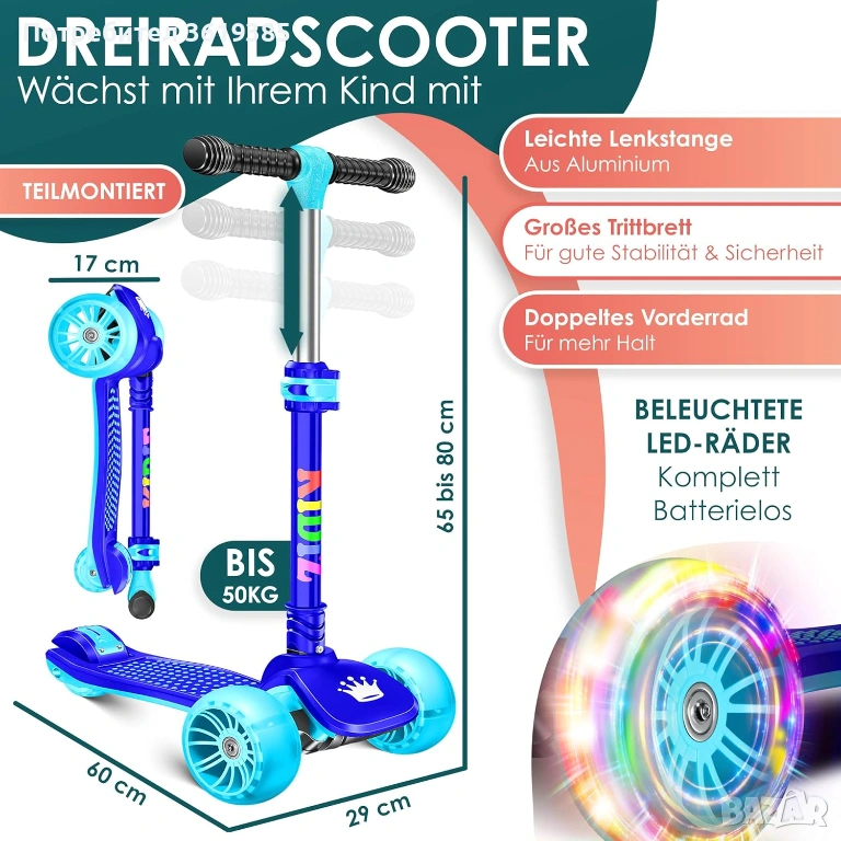 Детска тротинетка KIDIZ X-Pro2 с широки PU LED колела, функция за сгъване, регулируема височина на кормилото, двойно предно колело, интуитивно гравитационно управление, неплъзгаща се платформа и висококачествена алуминиева дръжка за момчета и момичета на възраст между 3 и 12 години.