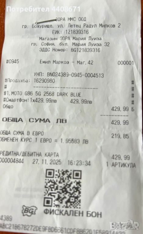 Продавам Motorola Moto G86 Power(12/256GB) 5G – най-новият модел от серията, купен на 28 ноември 2025 г. от магазин „Зора“.