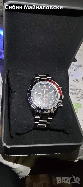 Продавам Seiko X кварц хронограф, носен един-два пъти, като нов, в луксозна подаръчна кутия. Хронографът не е декоративен, работи перфектно. Сменя дата коректно. Дизайнът напомня за класиките Seiko Pogue или Seiko Prospex, само че в изискана черно-червена гама. Цена €80. За гр. София предпочитам лично предаване, за страната — Еконт или Спиди с опция преглед и тест.