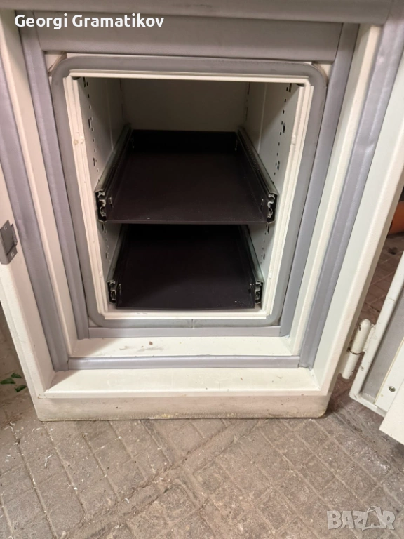 Продавам каса-сейф за пари. Огнеупорна и водоустойчива стара банкова каса с две издърпващи рафтчета.