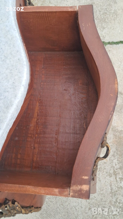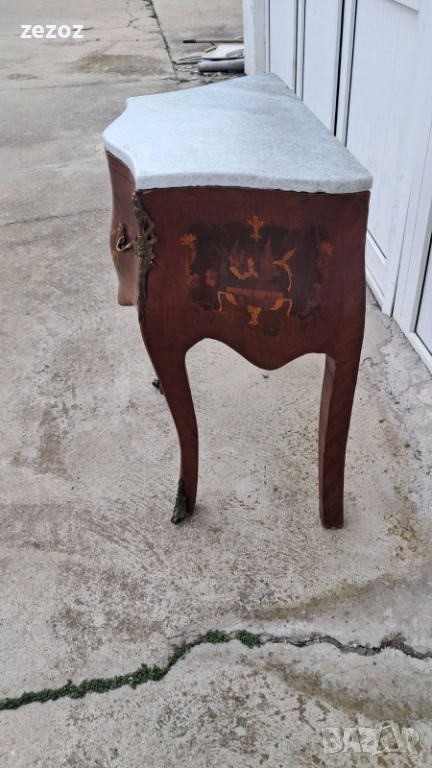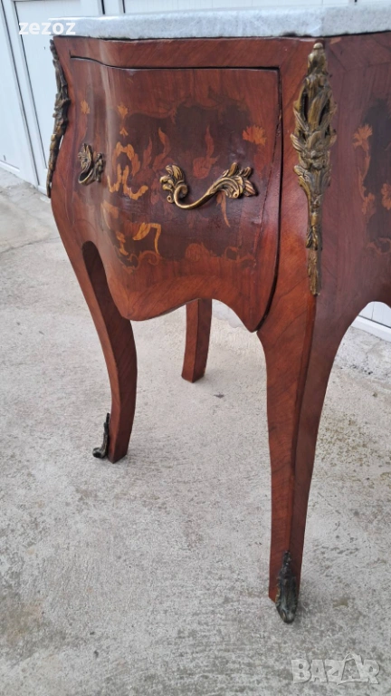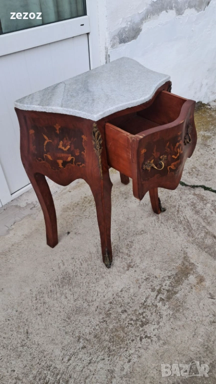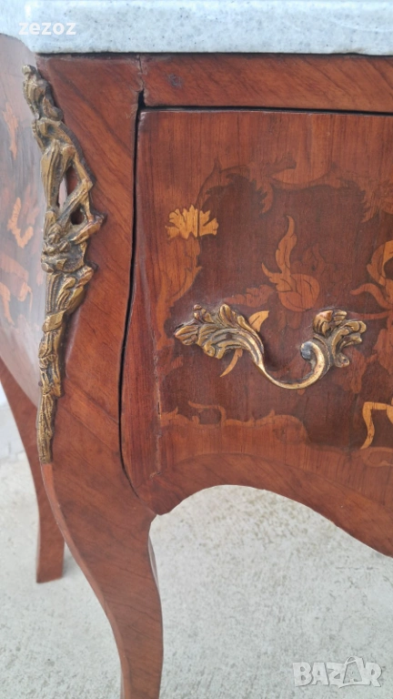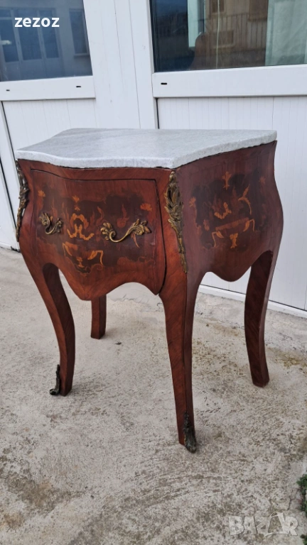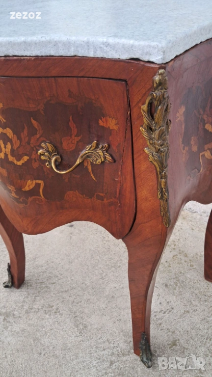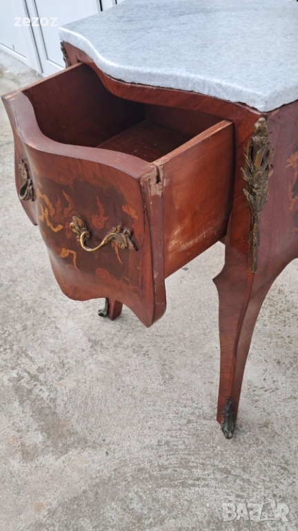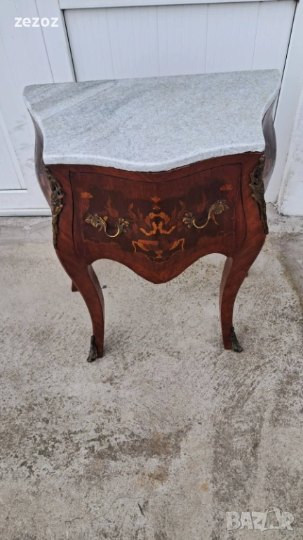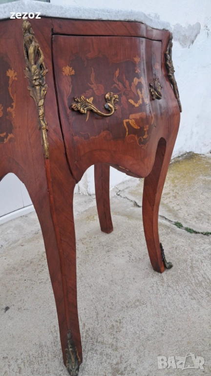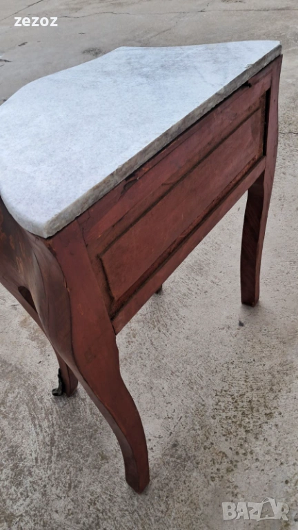 Ретро шкафче,изработено от масив в стил Луи 15.Характерните за стила тумбести форми "Bombe"Покрит с фурнир с интарзия.Месингов обков.Мраморен плот в бялата гама със сиви жилки.Здрав,но малко грубовати ръбове.Шкафчето е с едно чекмедже.Конструктивно здраво с нормални забележки от годините.Лично предаване.Размери-