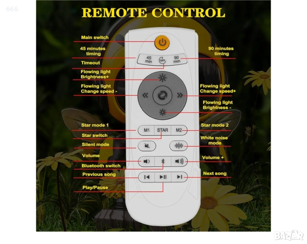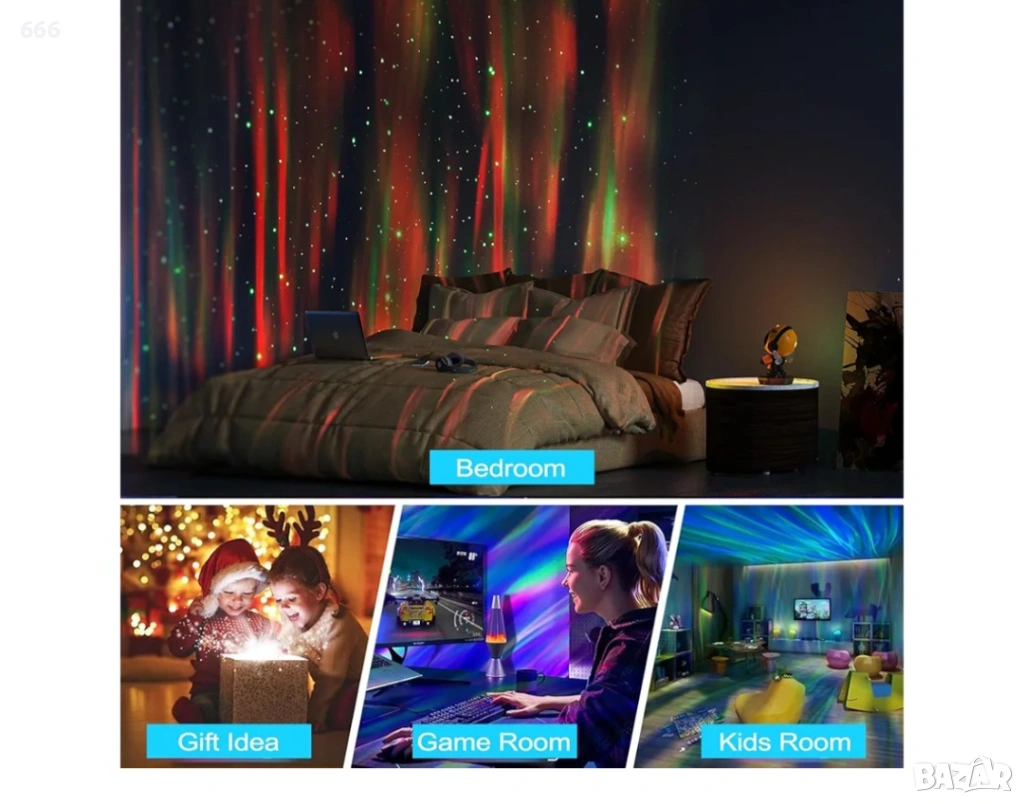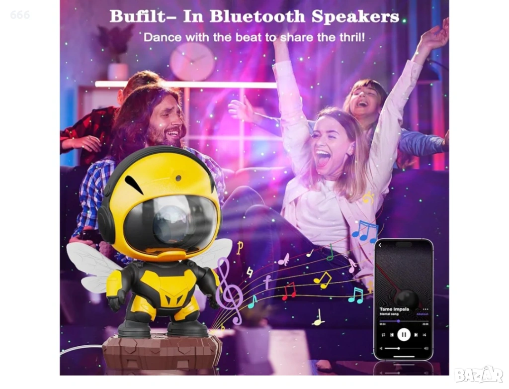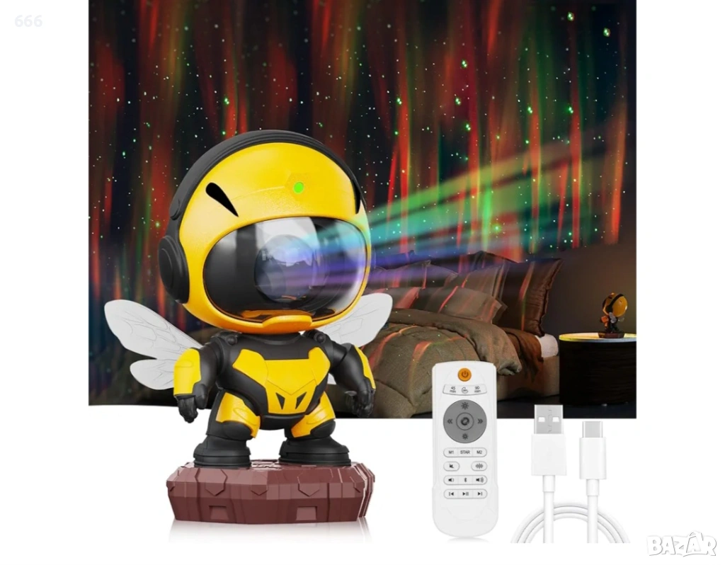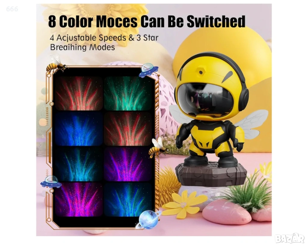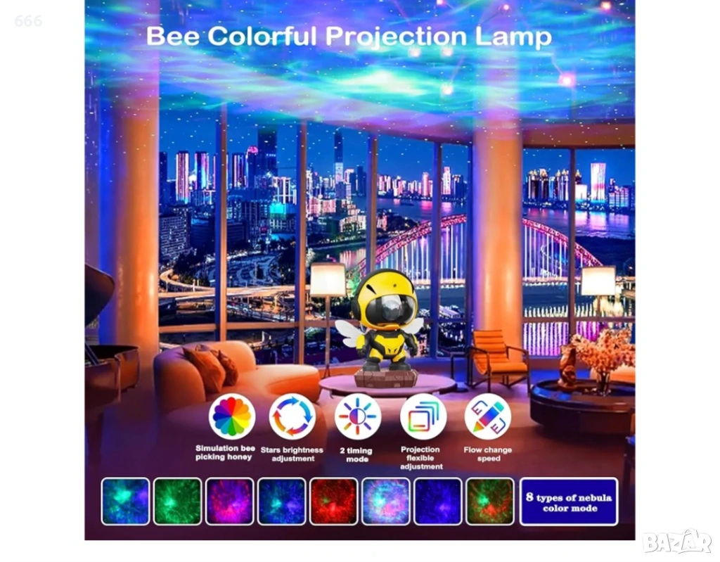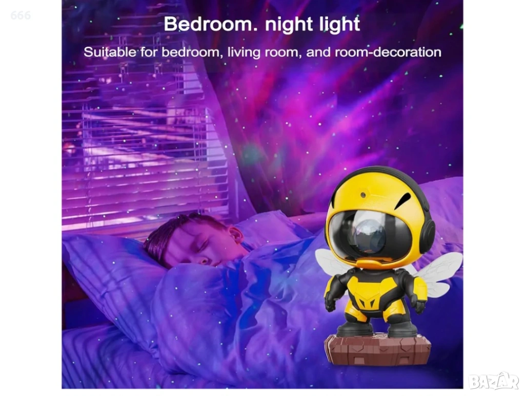 Проектор за мъглявини „Малка пчела“: Този проектор за звездно небе предлага 8 хипнотизиращи ефекта на мъглявини, съчетани с нежно пулсиращи зелени звезди. Той създава спокойна и релаксираща атмосфера във вашата спалня или детска стая. Също така е чудесен избор за филмови вечери, срещи или игри.