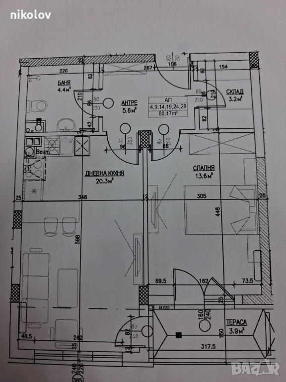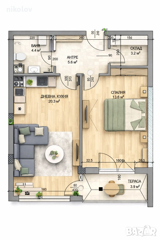 🧱 Разпределение: дневна с кухня, спалня, антре, баня с WC, тераса