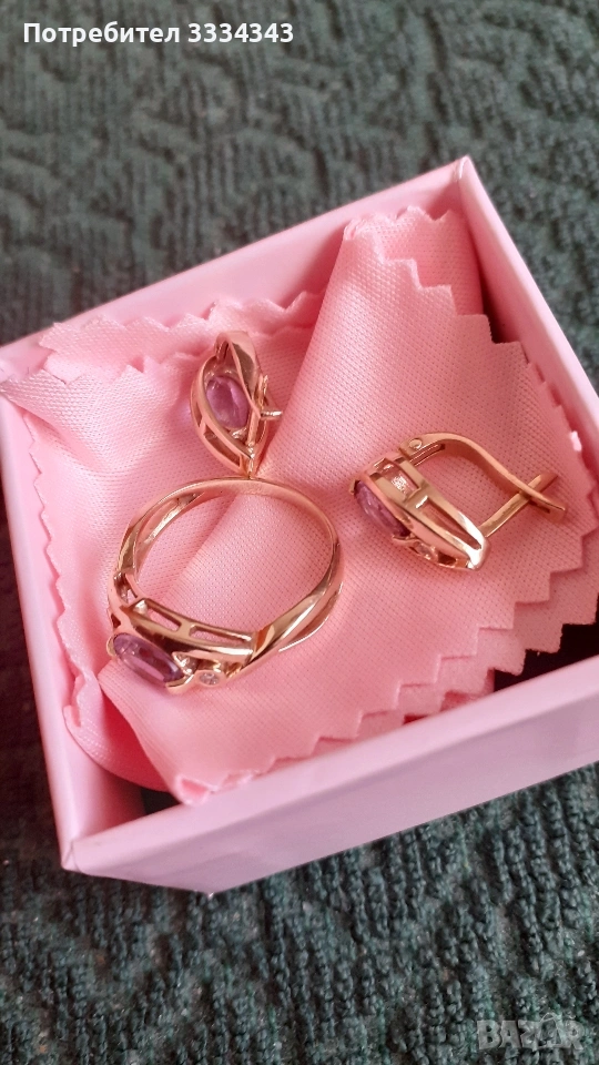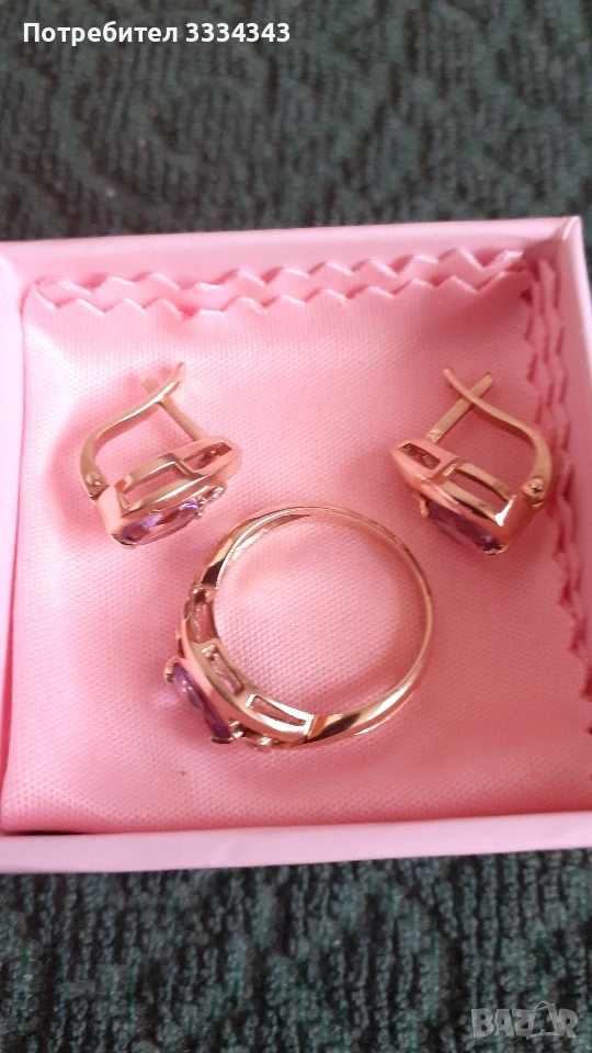 Продавам чисто нов комплект златни бижута от пръстен и обеци, с диаманти и естествен камък "аметист".