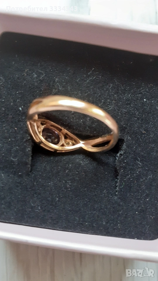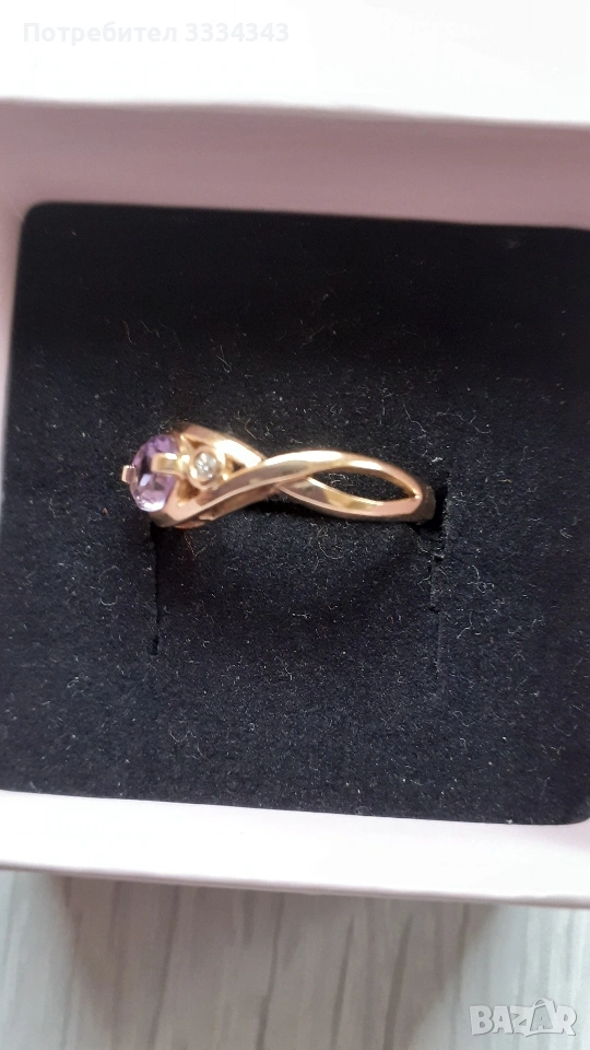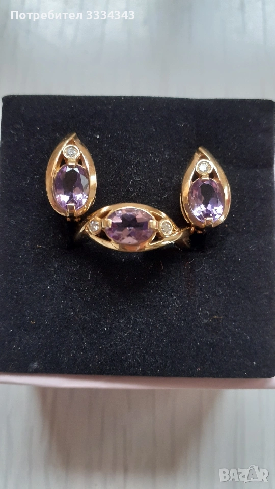 Продавам чисто нов комплект златни бижута от пръстен и обеци, с диаманти и естествен камък "аметист" → Обява 54064521