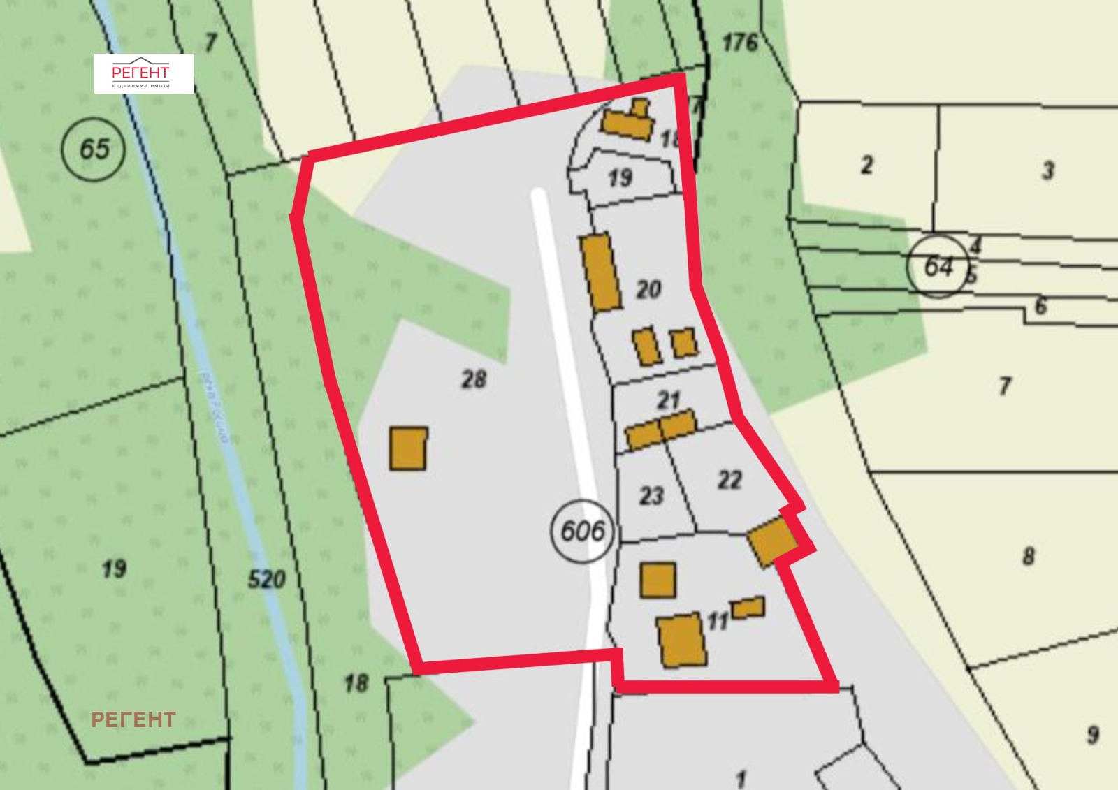 Имотът е с обща площ 9 235 кв.м., включващ осем броя урегулирани поземлени имоти заедно с построените в тях едно и двуетажни жилищни сгради, стопански постройки и навеси.