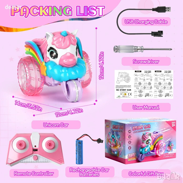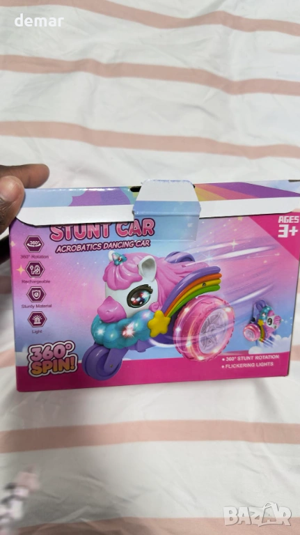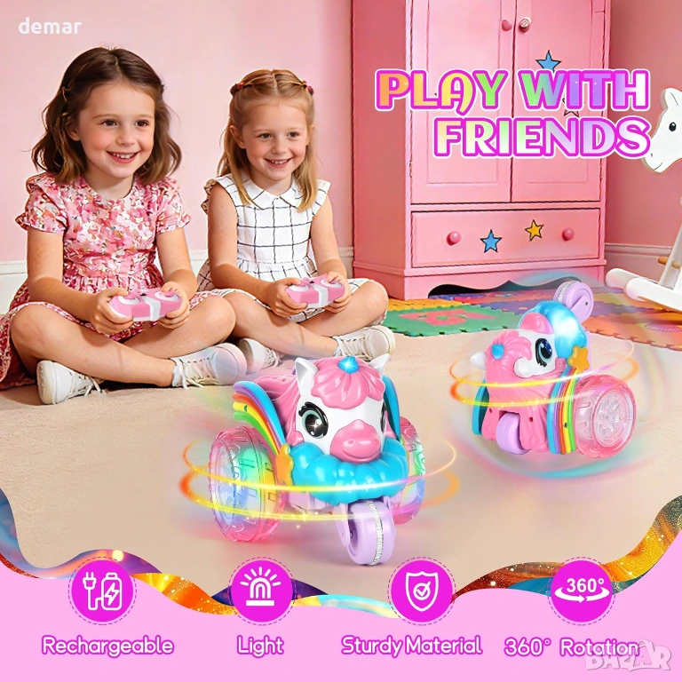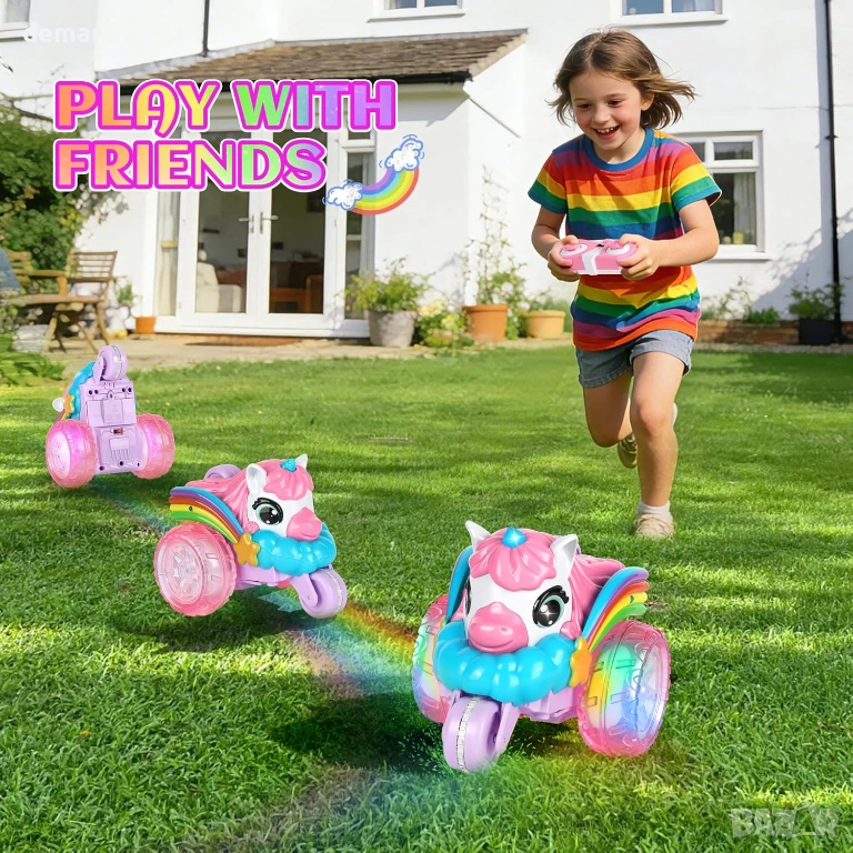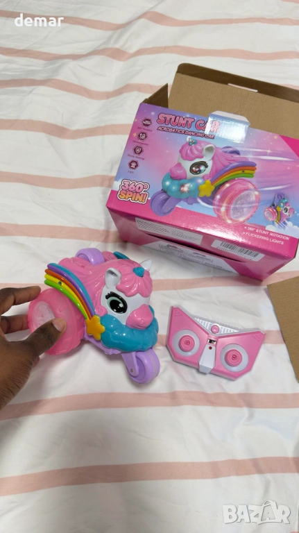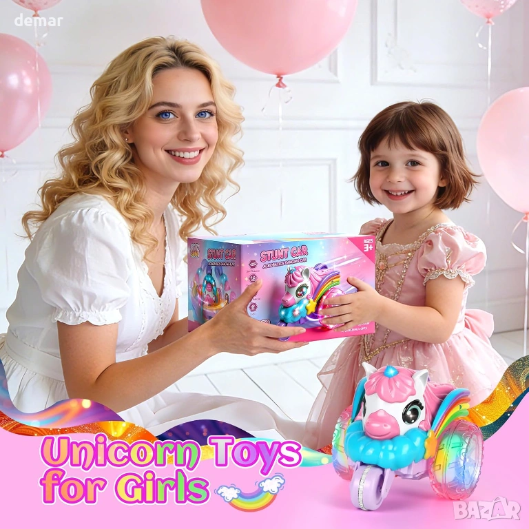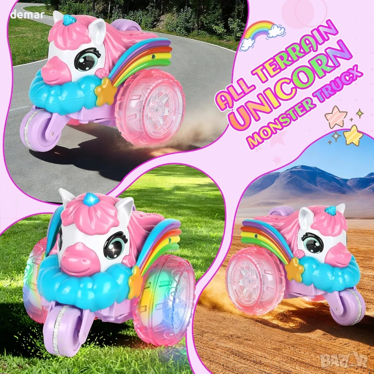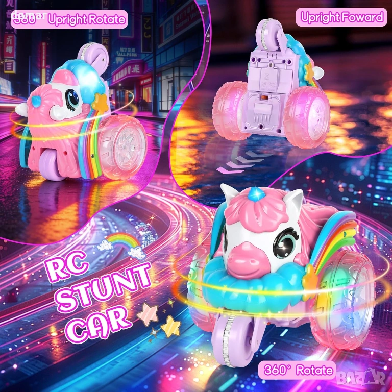 Визуално впечатляващо каскадьорско превозно средство с дистанционно управление на тема еднорог, отличаващо се с уникален дизайн с три колела, големи прозрачни гуми с LED осветление, цветни крила и динамични светлинни ефекти за игра през деня и нощта. Способно да изпълнява 360-градусови обръщания и трикове с изправено шофиране, то предлага завладяващи каскадьорски действия с издръжлива, удароустойчива конструкция, подходяща за различни повърхности. Дистанционното управление 2.4 GHz осигурява стабилно и без смущения управление до 40 метра, а акумулаторната батерия осигурява до 60 минути непрекъсната употреба чрез удобно USB зареждане. Изработено от безопасни, нетоксични материали с гладки ръбове, то е лесно за управление от деца и е проектирано да насърчава координацията, креативността и активната игра, представено в подаръчна кутия на тема еднорог, идеална за специални поводи.