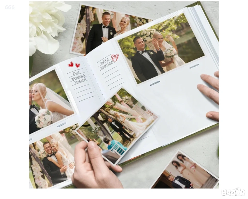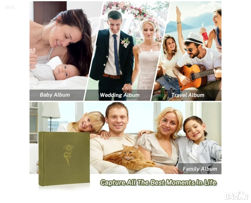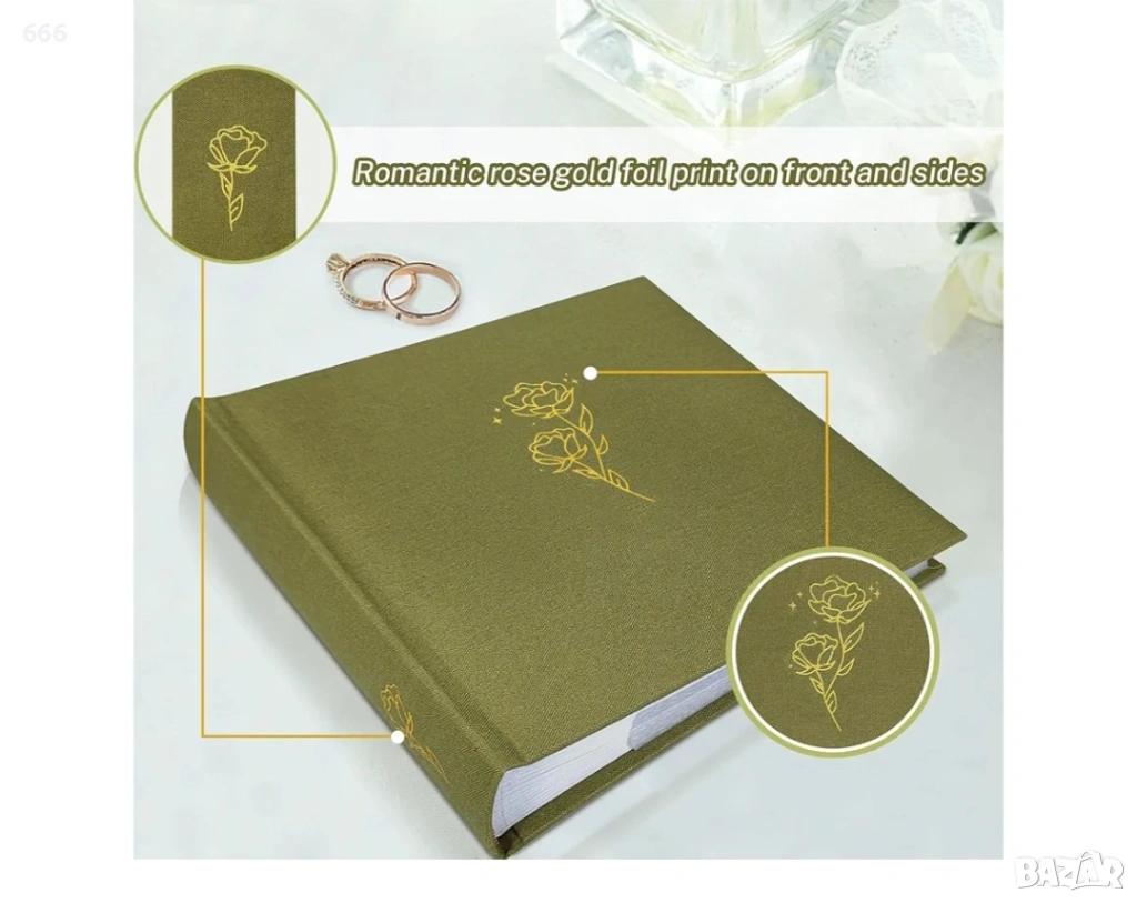 Капацитет от 200 снимки с функция за водене на дневник на спомени: Запазете спомени с размер 4x6 на 100 страници без киселини (200 джоба) с обособени места за писане. Луксозната ленена подвързия с акценти от розово златисто фолио елегантно представя сватби, бебешки събития или семейни събирания. 3 изискани цветови варианта се съчетават с домашния декор.