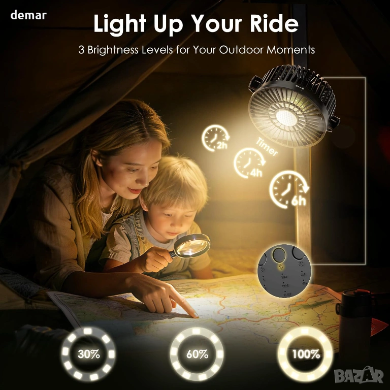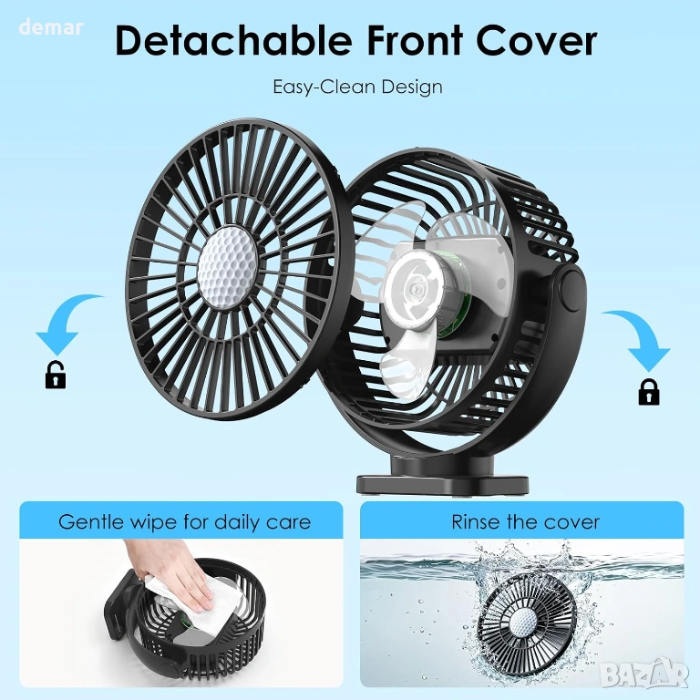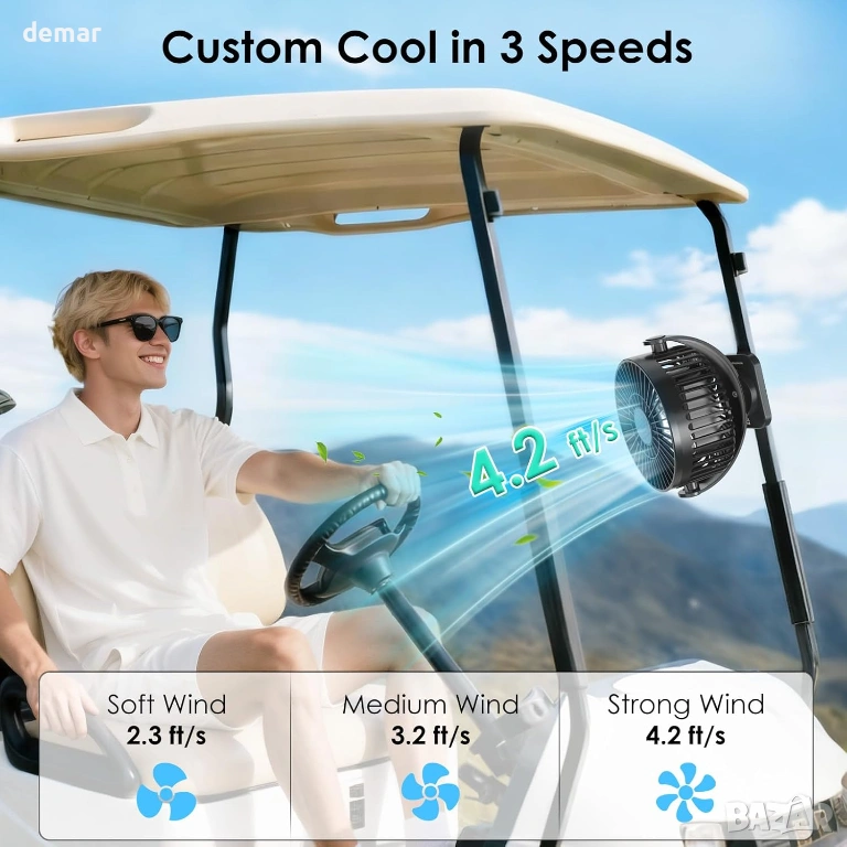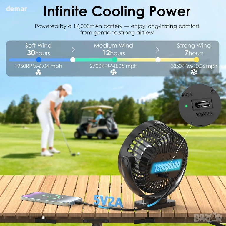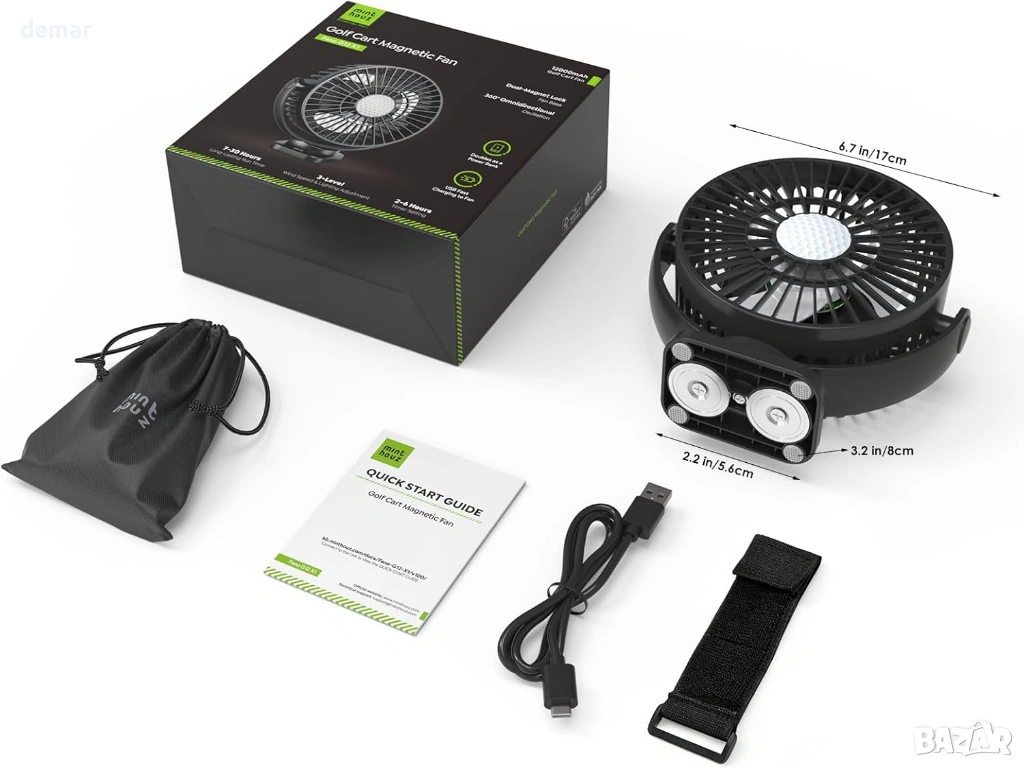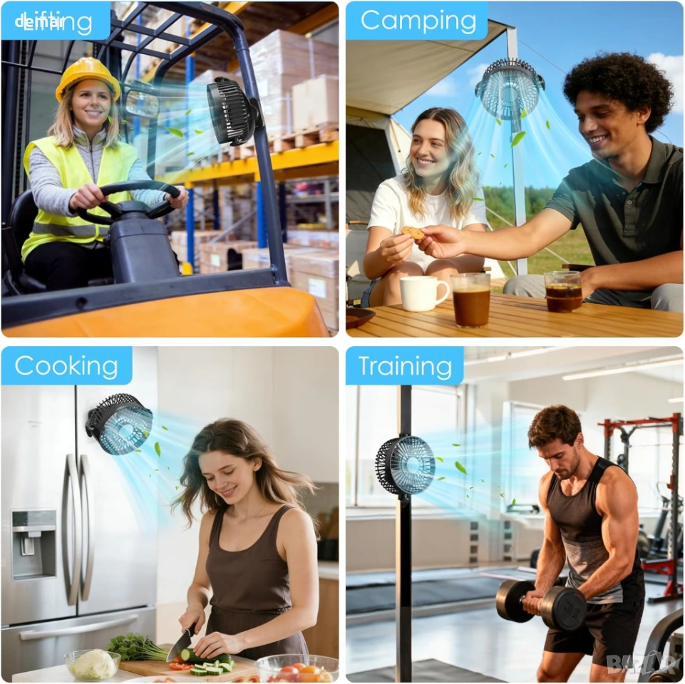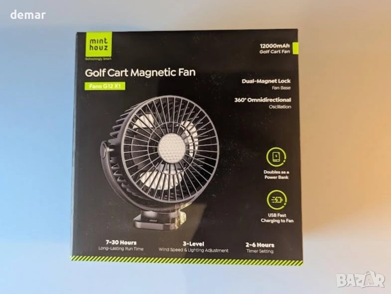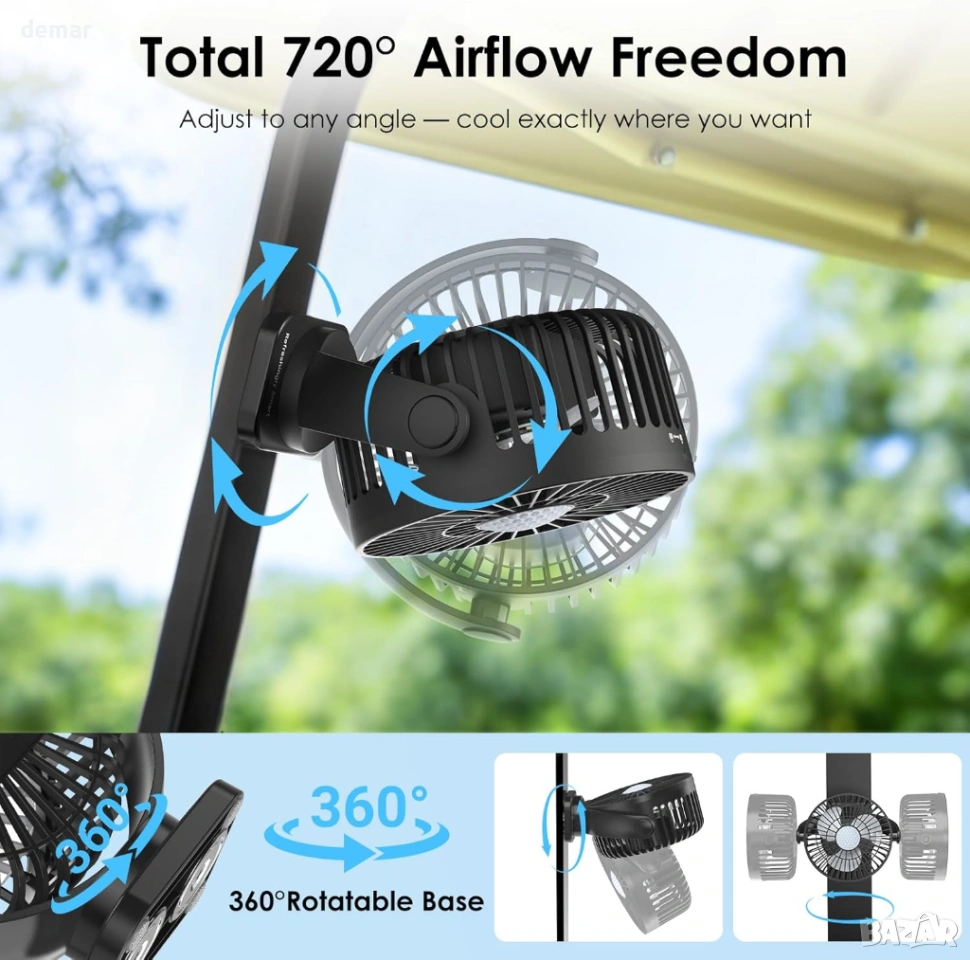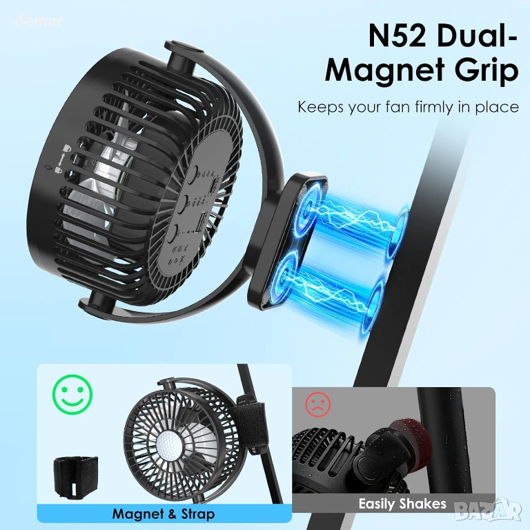 Компактен преносим вентилатор със супер здрава двойна магнитна основа N52 и подсилена каишка за сигурно закрепване към метални повърхности, може да се използва и като настолен вентилатор. Разполага с батерия от 12000 mAh, осигуряваща 7–30 часа работа с бързо зареждане през USB и Type-C, включително функционалност на преносима батерия за зареждане на устройства. Предлага 360° регулируем въздушен поток с три настройки на скоростта за тихо, но ефективно охлаждане, заедно с интелигентен таймер 2/4/6 часа и тристепенно LED меко осветление за допълнително удобство. Проектиран за многостранна употреба в голф колички, лодки, кемпери, дейности на открито и ежедневни ситуации, с тънка, удобна за пътуване конструкция и включена чанта за носене.