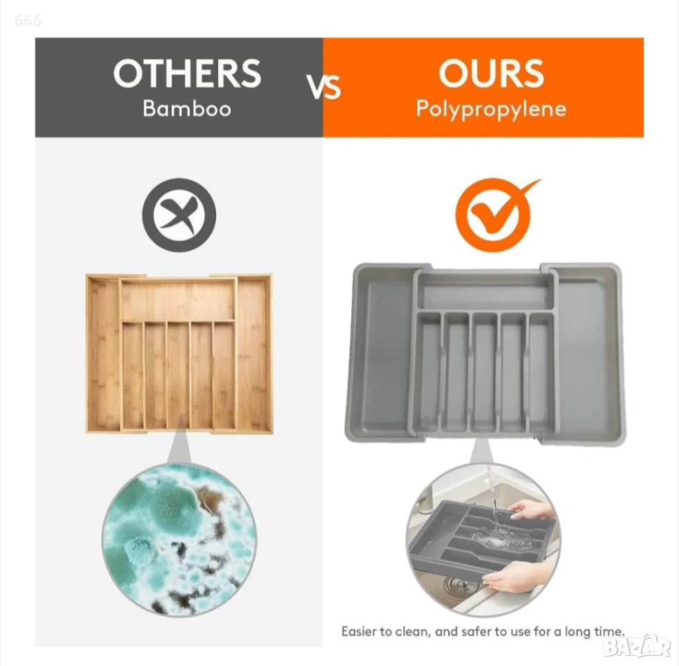 【Лесно почистване】Таблото за прибори за хранене е много лесно за почистване. За почистване просто изплакнете с вода за дезинфекция. Нашите пластмасови кутии за съхранение на прибори за хранене няма да причинят здравословни проблеми при продължителна употреба.