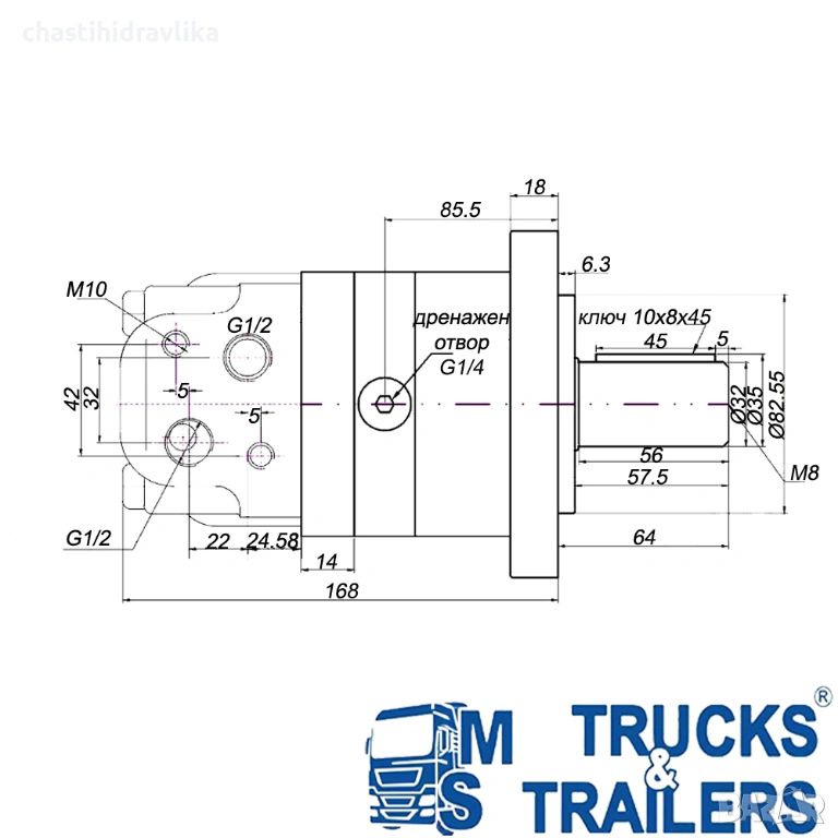 Присъединителните отвори на хидромотора са с резба G ½“, която отговаря на стандарта BSPP (British Standard Pipe Parallel).