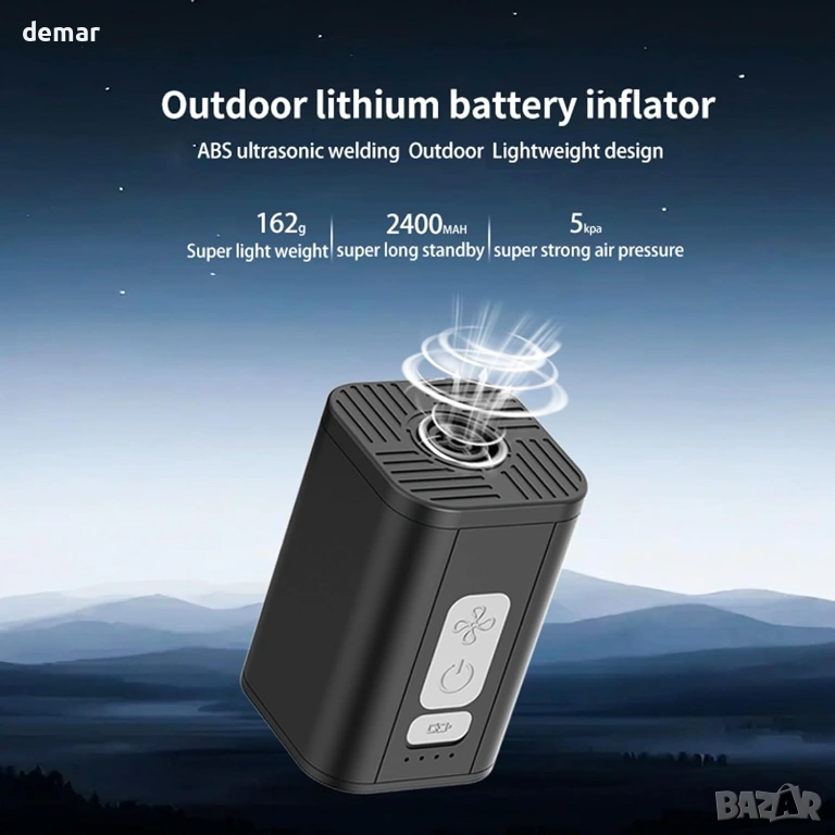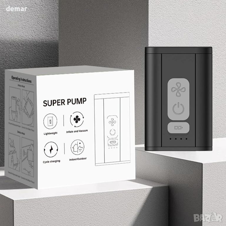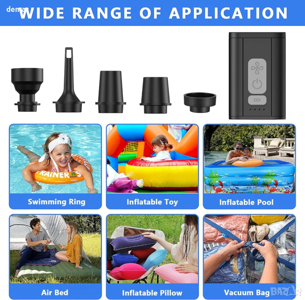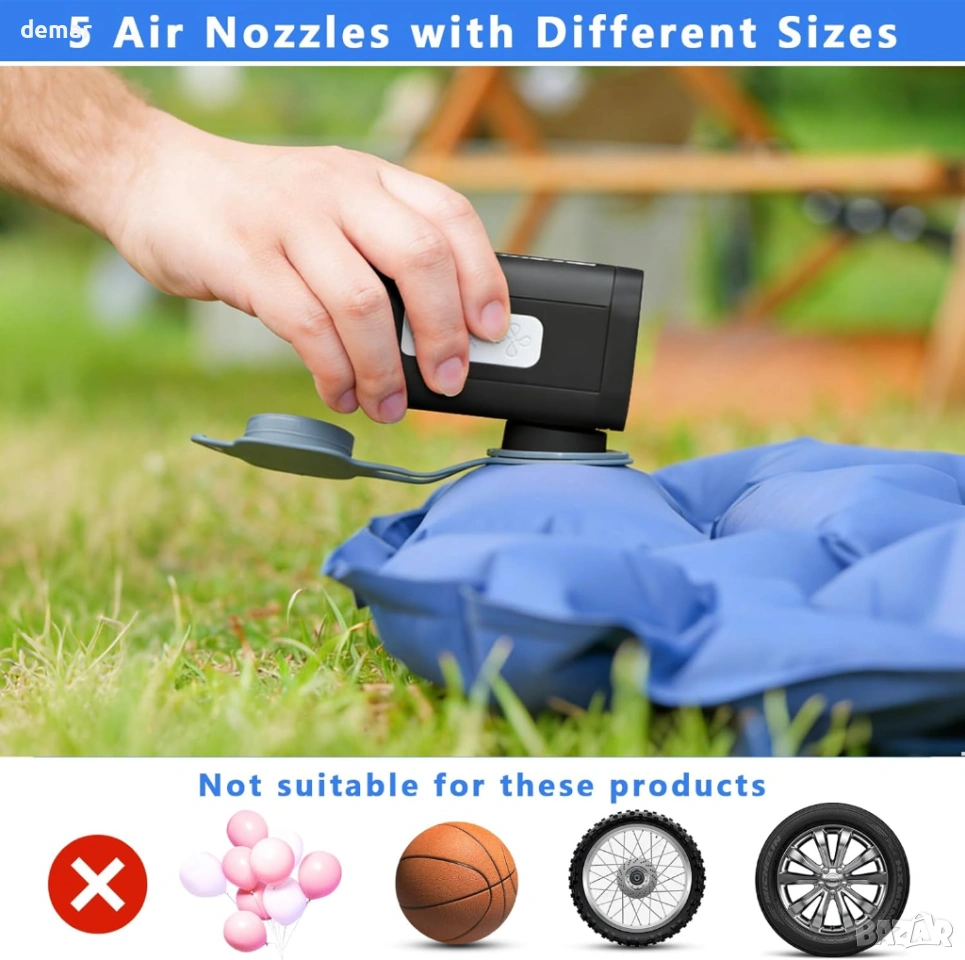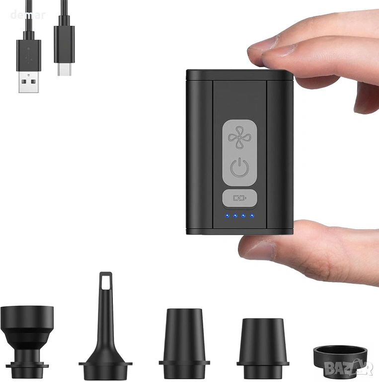 Мощна електрическа въздушна помпа с мощност 5kPa, проектирана за бързо и лесно напомпване и изпускане на различни надуваеми предмети, значително намалявайки ръчното усилие и спестявайки време. Включва пет сменяеми накрайника, които пасват на повечето стандартни клапани, което я прави подходяща за предмети като надуваеми матраци, плувки за басейн, вакуумни торбички и надуваеми играчки. Оборудвана с акумулаторна батерия 2400mAh, тя осигурява до 45–60 минути работа и поддържа удобно зареждане с Type-C чрез външни батерии, лаптопи, зарядни за кола или адаптери. Компактният и лек дизайн осигурява лесна преносимост и съхранение, което я прави практичен избор за къмпинг, пътуване, дейности на открито и ежедневна домашна употреба.