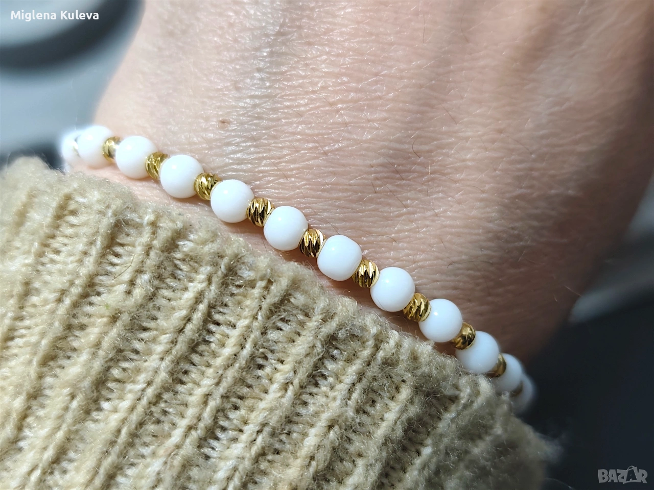 Ластична гривна с Бял Ахат и Мъниста в златисто → Обява 54064894
