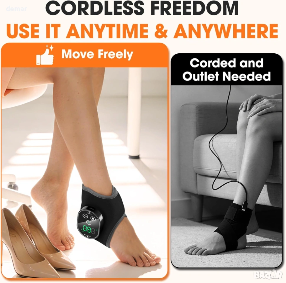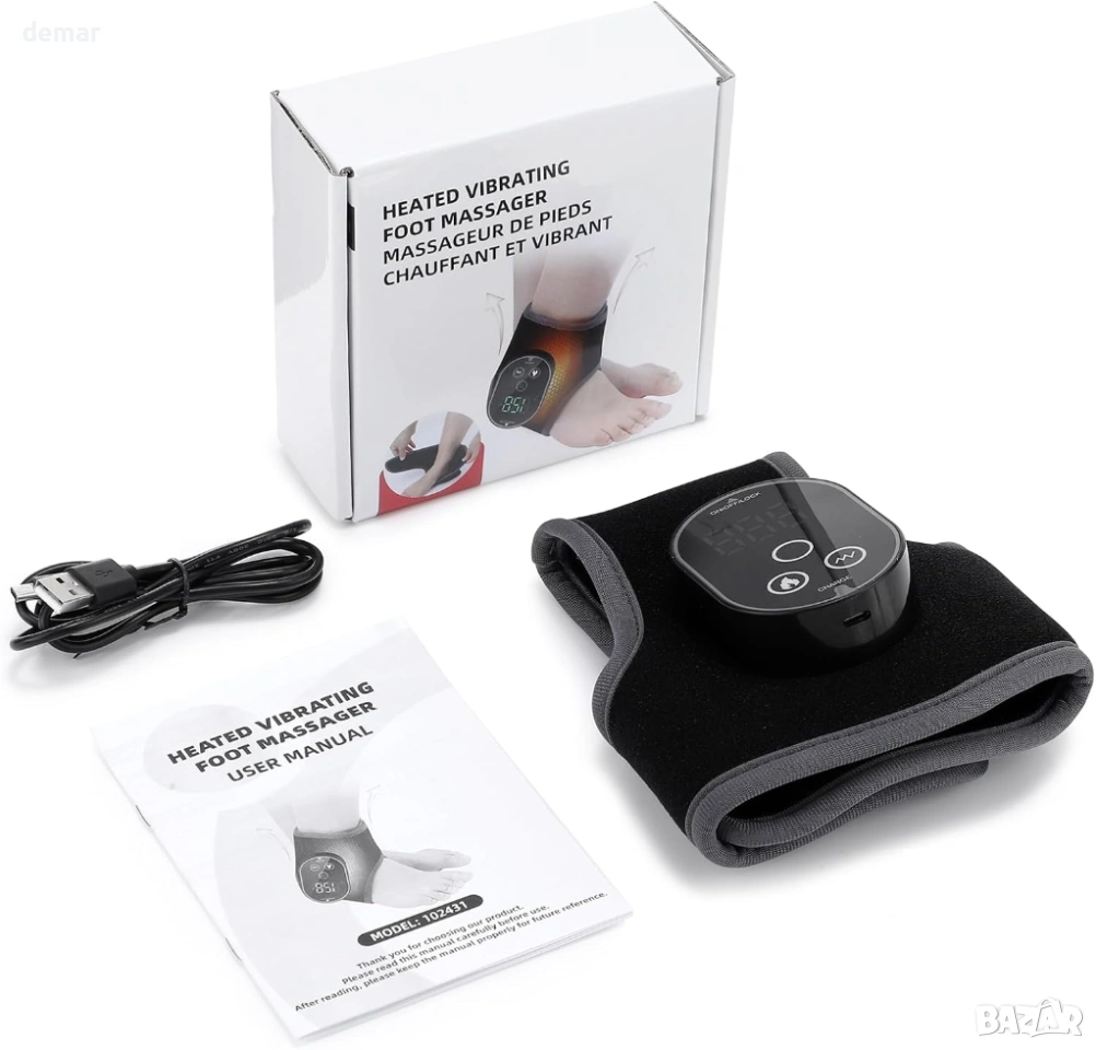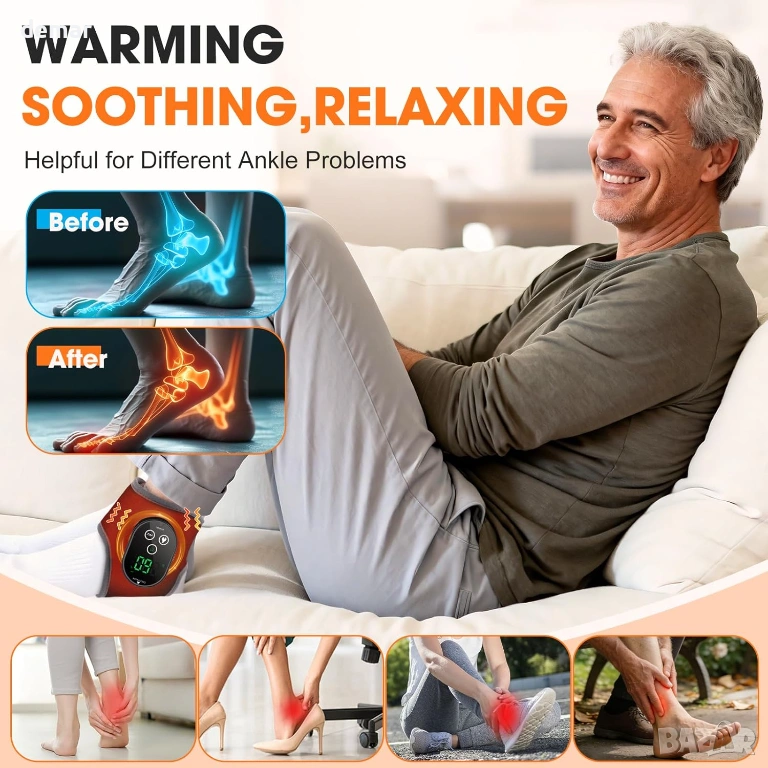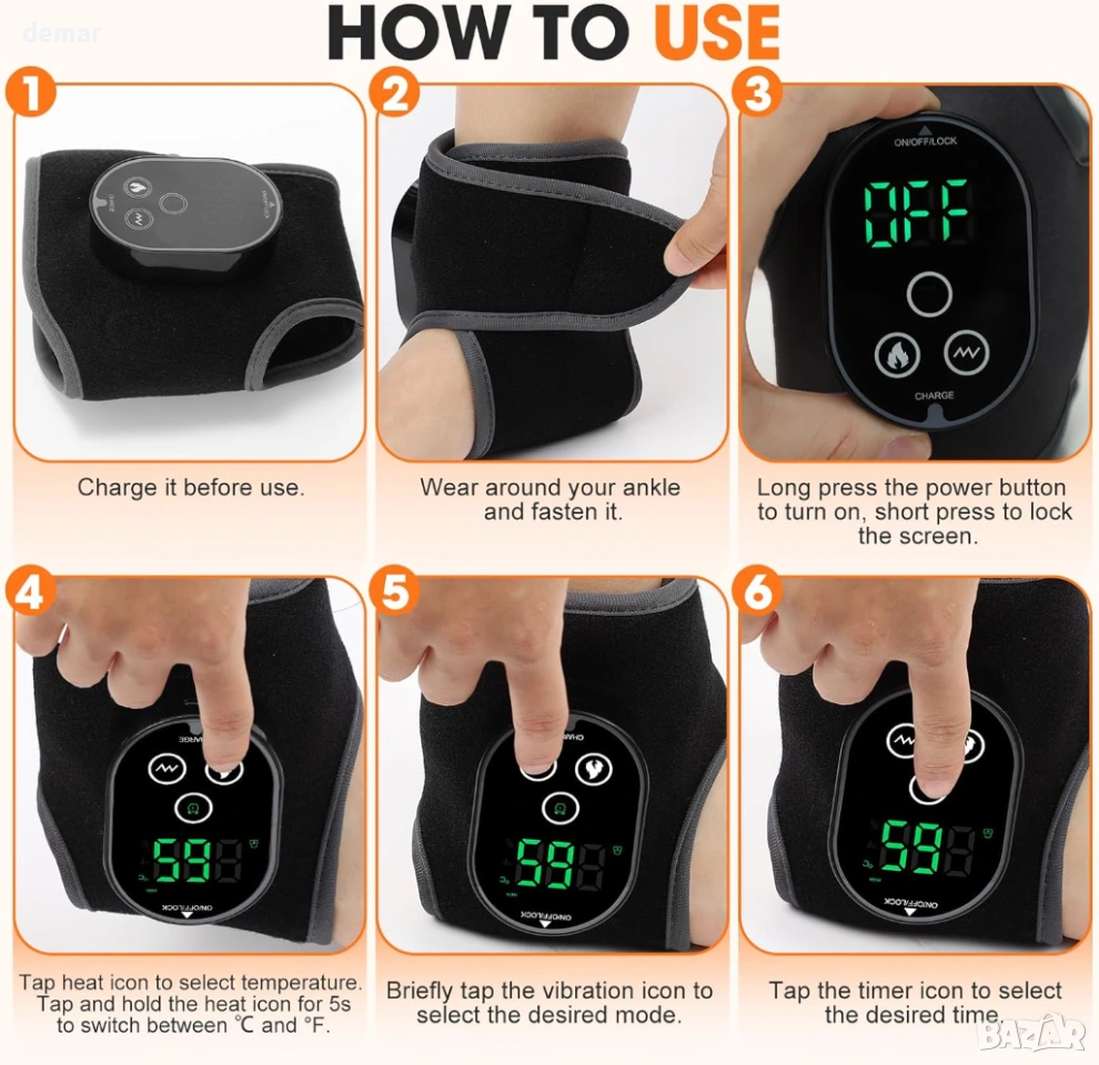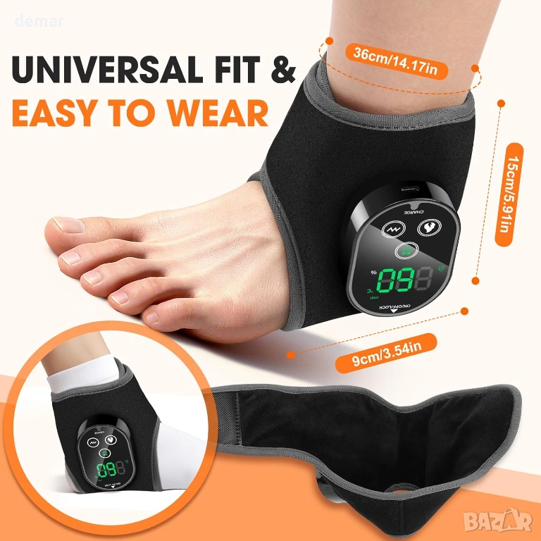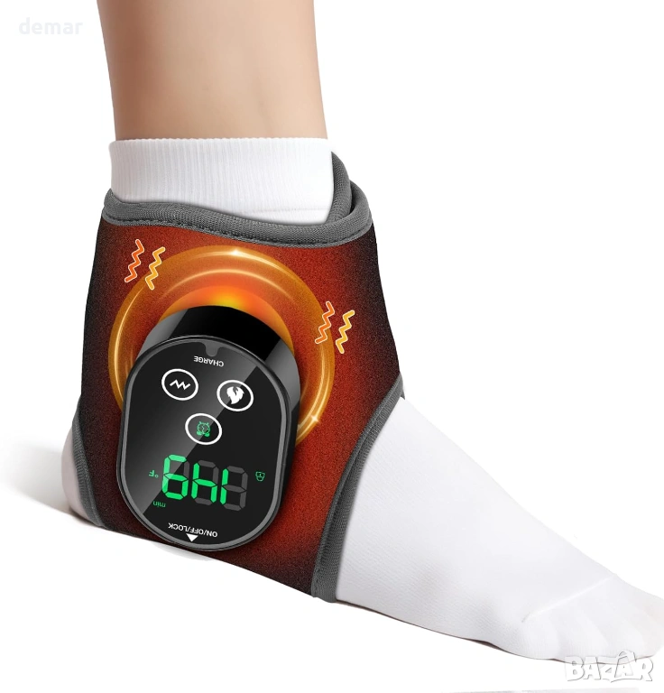 Тази отопляема подложка за глезена разполага с интуитивен сензорен контролен панел с предпазно заключване, автоматично изключване и защита от прегряване за безопасна употреба в различни условия. Предлага четири регулируеми нива на топлина, вариращи от 50°C до 65°C, заедно с три режима на вибрационен масаж, които постепенно увеличават интензивността си за по-персонализирано изживяване. Проектирана с мек, разтеглив материал, тя приляга удобно около глезена и стъпалото, като същевременно остава здраво на мястото си. Устройството включва три опции за таймер (20, 30 или 45 минути) с настройка по подразбиране за 30-минутно автоматично изключване за удобство. Вградената акумулаторна батерия с капацитет 3000 mAh позволява безжична, преносима употреба, което я прави подходяща за релакс у дома или в движение, и може лесно да се почиства с влажна кърпа.