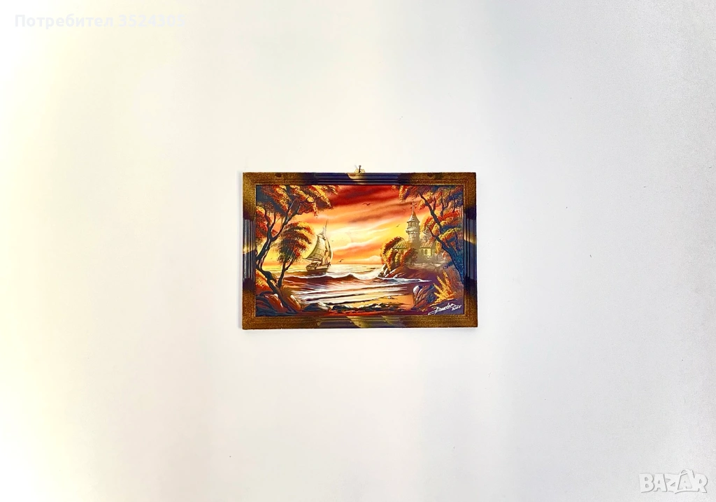 Морски пейзаж в стила на XIX век от края на 20-ти век (70-те–90-те години). Картината не е изработена в класическата традиция на изящните изкуства и вероятно става дума за гравюра или прерисувана гравюра върху картон/платно, след което е ръчно доработена с боя за придаване на текстура. Прилича на декоративен реализъм вероятно вдъхновена от художници като Клод-Жозеф Верне. (Продавани в магазини за мебели, магазини за интериорен дизайн и туристически райони.)