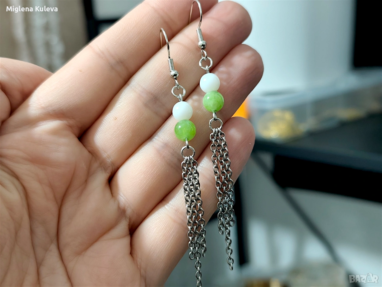 Висящи обеци с Зелен Перидот, Бял Ахат и неръждаема стомана → Обява 54065209