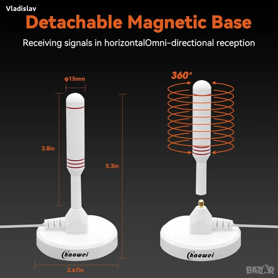 360 Omnidirectional FM UHF прием - 1) Работи както на закрито, така и на закрито 2) Красивата солидна магнитна основа осигурява стабилно прилягане и подобрява приема, когато я поставите върху нещо метално. 3) Идеална е за Freeview и DAB предавания