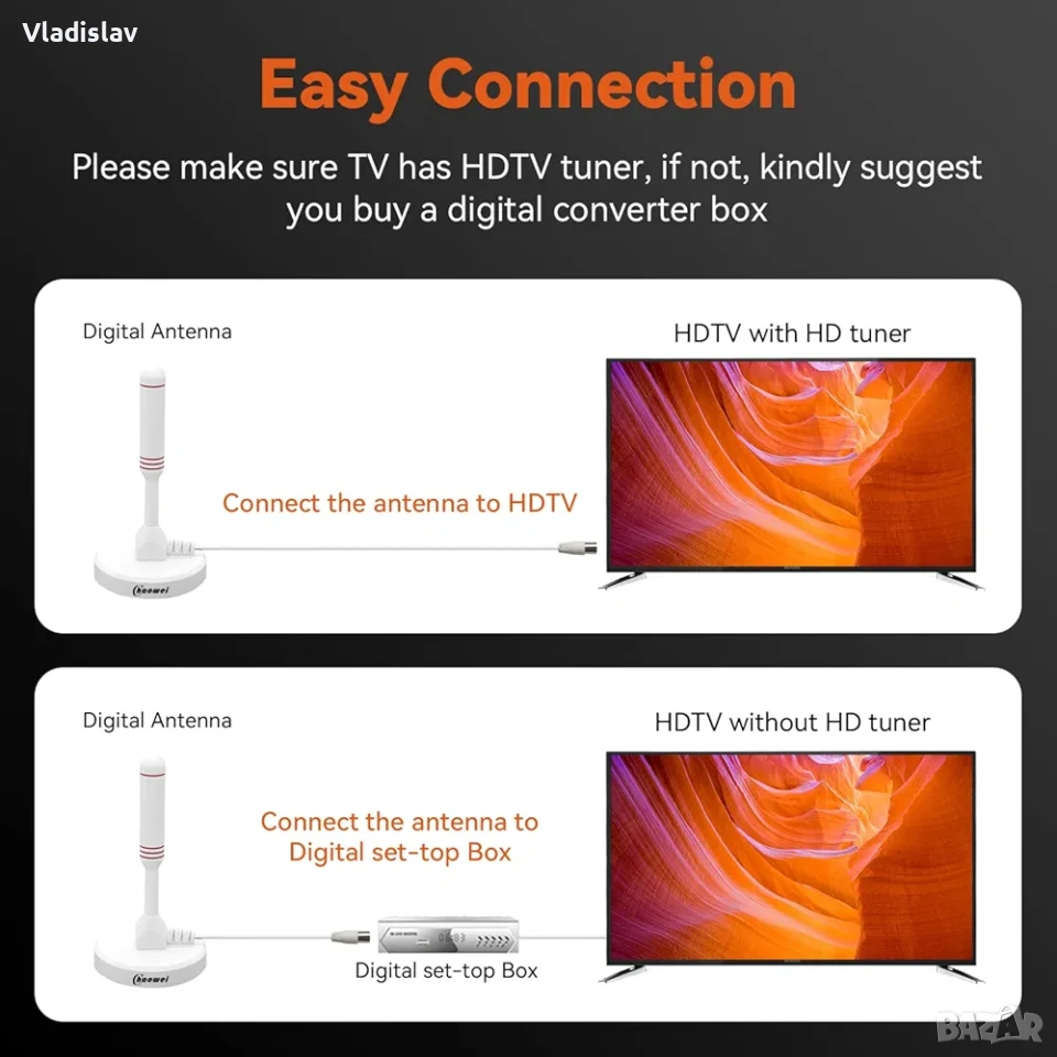 Лесна за сглобяване - само от две части: 1) Завийте антената към основата; 2) Просто поставете антената в TV/HDMI и сте готови. 3) Преместете я за по-добър прием. Моля, изпълнявайте „Автоматично сканиране“ след всяко преместване.