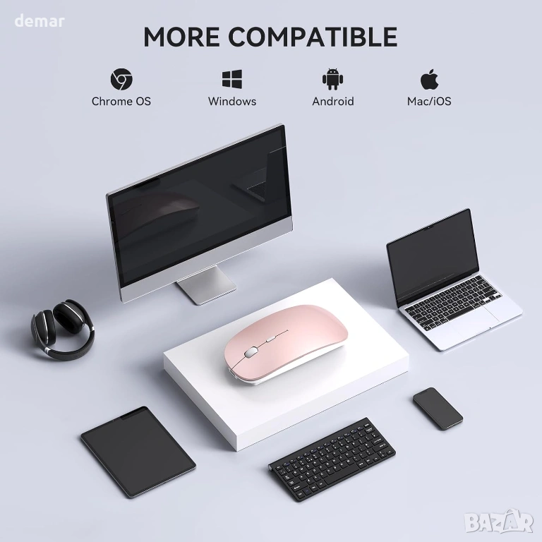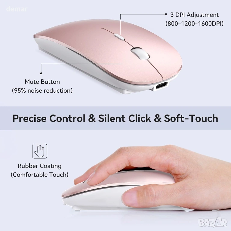безжична мишка разполага с два USB-A и Type-C приемници за безпроблемна съвместимост между лаптопи, настолни компютри, таблети и смартфони без адаптери. Тя предлага ултратихо щракване с намаляване на шума с над 90%, което я прави идеална за споделени или тихи среди. Зареждаща се чрез Type-C, тя осигурява дълготрайна батерия с едно зареждане, елиминирайки необходимостта от честа смяна. Проектирана за комфорт, тя включва меко, неплъзгащо се гумено покритие и ергономична форма за намаляване на умората на ръцете по време на продължителна употреба, докато тънката и лека конструкция осигурява лесна преносимост. С елегантен, минималистичен дизайн и plug-and-play функционалност, тя позволява бърза настройка и ефективна работа както за работа, така и за ежедневни задачи.