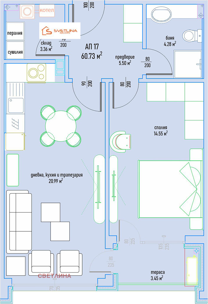 - Разпдеделение: входно антре, дневна с кухненски бокс, спалня, баня с тоалетна, мокро помещение и тераса