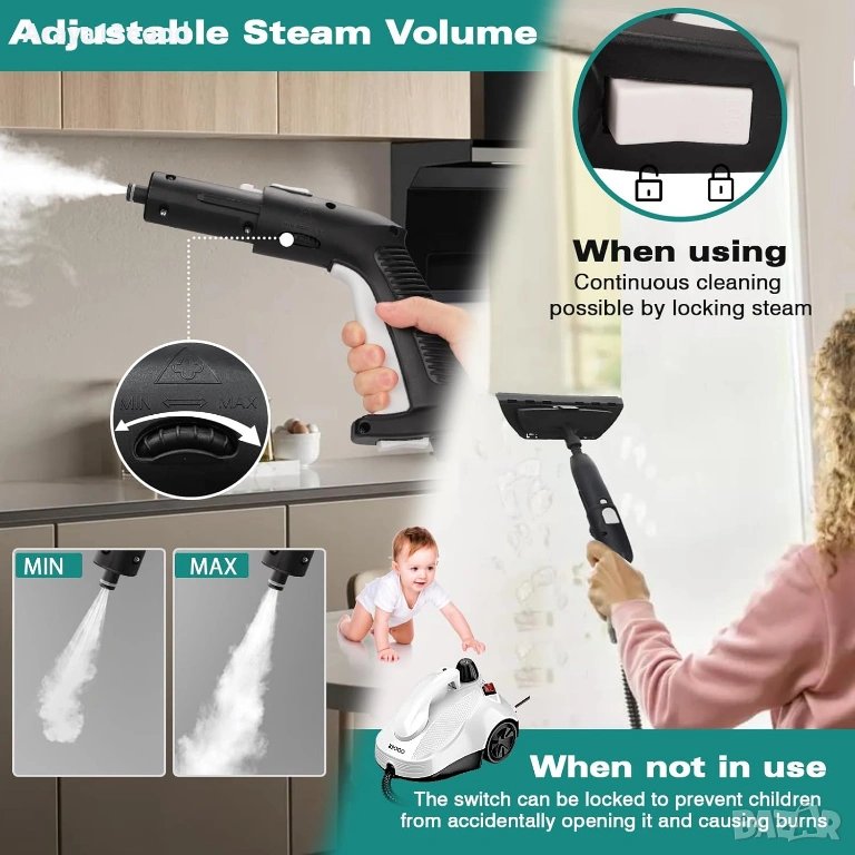 Подходящ за домове, хотели, ресторанти и автомобили. Идеален за почистване на подове, плочки, фуги, тапицерии, прозорци, кухненски уреди и премахване на трудни петна или тапети.