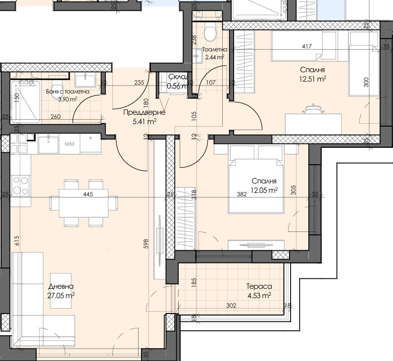 ✔️ Разпределение: Хол с кухненски бокс, Две спални, Баня с тоалетна, Тоалетна, Предверие, Склад и Тераса