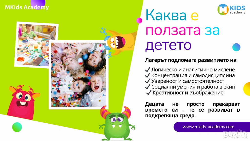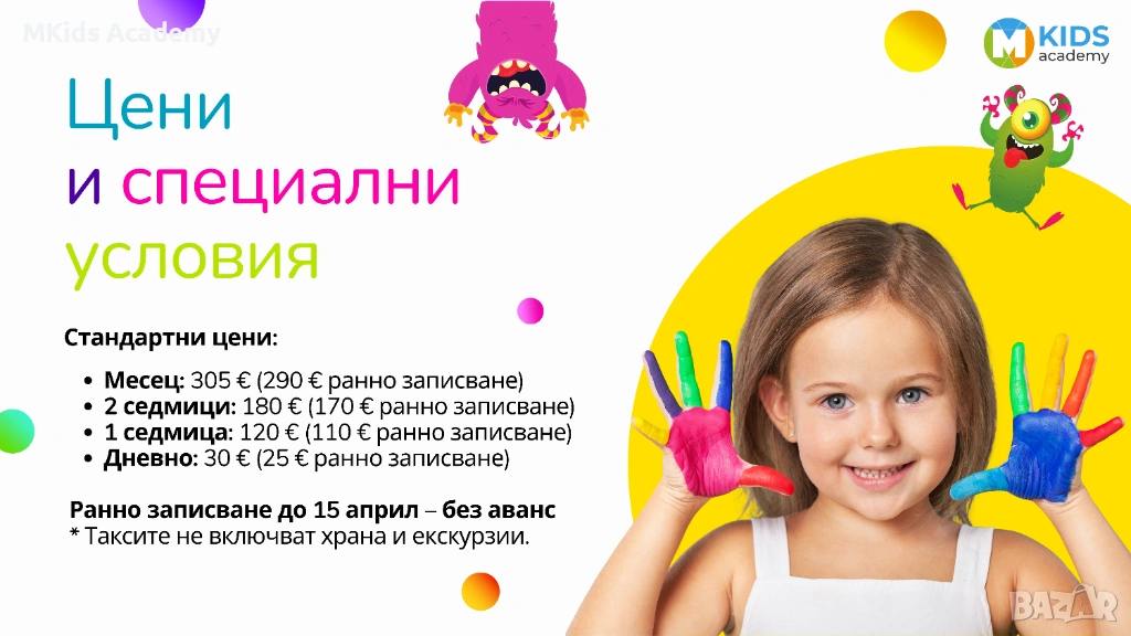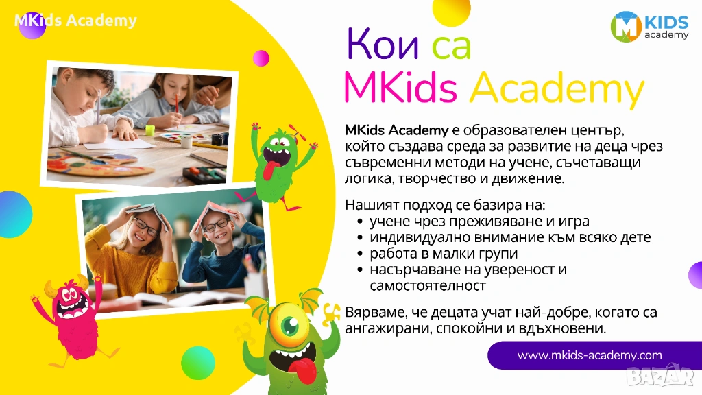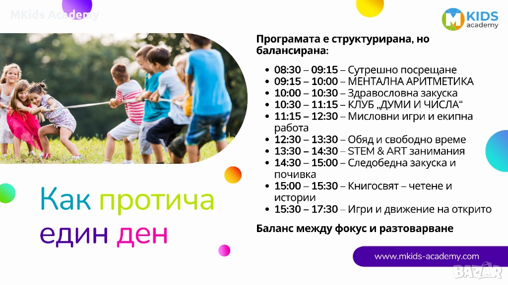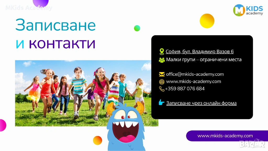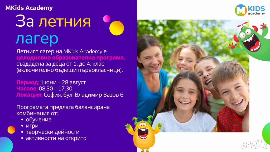 Лятната занималня на MKids Academy е целодневна програма за деца от 1. до 4. клас, в която съчетаваме учене, игри и творчество в спокойна и подкрепяща среда.