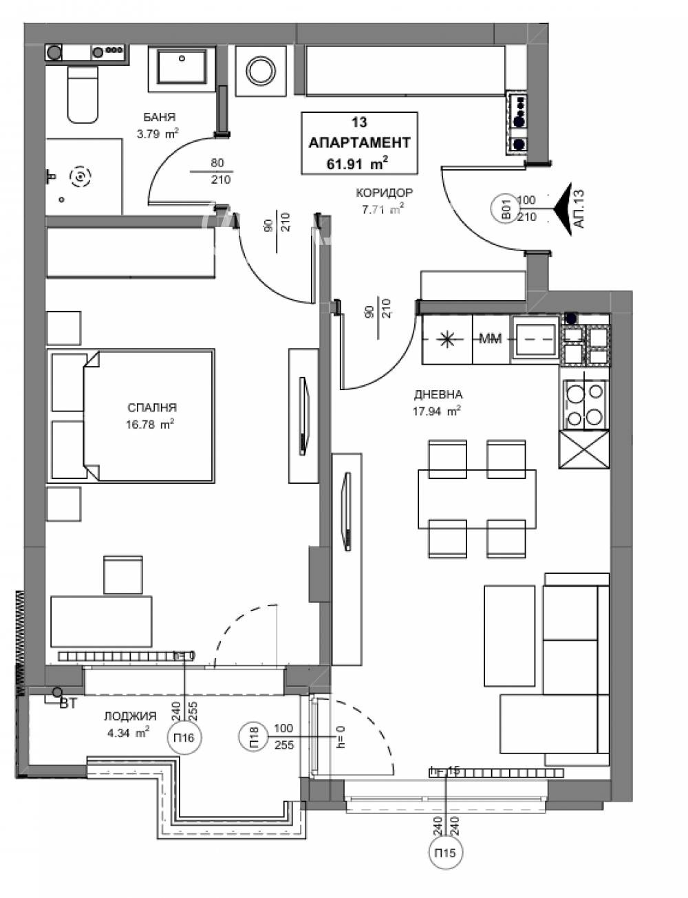 Двустаен апартамент с РЗП- 75,73м?, ЗП-61,91м? с включен склад 13 - 2,37м?. Разпределение: коридор, дневна с кухненски бокс и трапезария, спалня, баня с тоалетна, обособено пространство за пералня и гардероб, лоджия. Отопление ТЕЦ. Изложение южно.