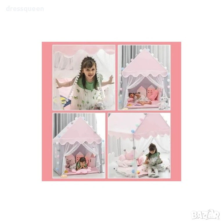 Търсите незабравим подарък, който ще превърне детската стая в приказно царство? Тази очарователна розова палатка тип Замък е сбъдната мечта за всяка малка принцеса. Със своите нежни мрежести завеси, украсени с помпони, тя създава уютно и магично място за игри, четене на приказки или следобедна почивка. Стилната комбинация от розов покрив и сиви стени я прави красиво допълнение към всеки интериор, а голямото пространство вътре позволява на детето да покани и приятели в своята нова крепост.