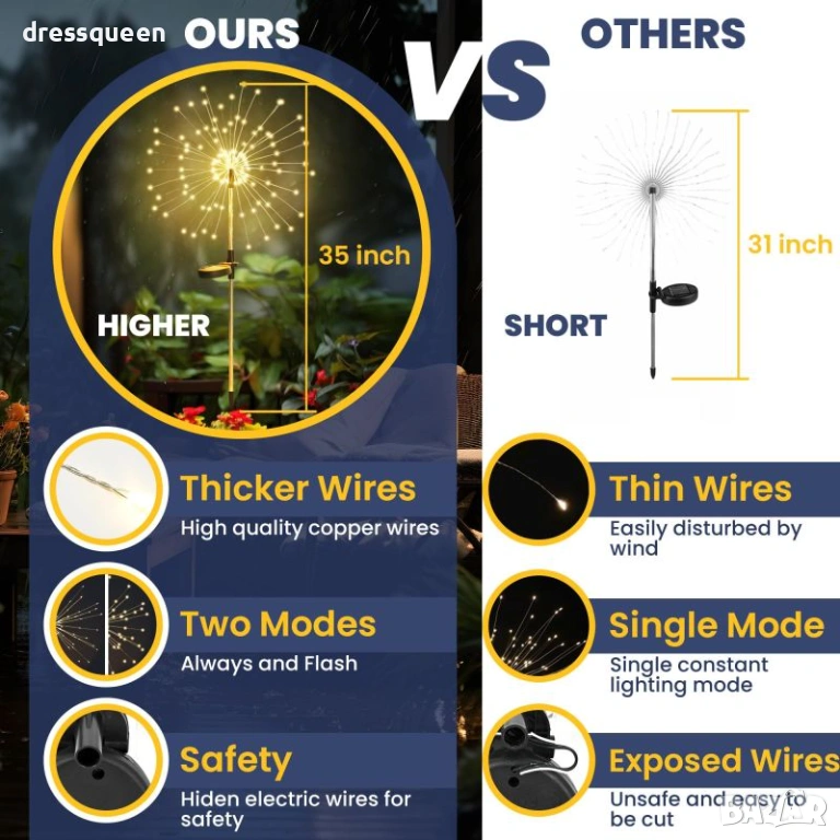 Със своята топла жълта светлина и възможност за оформяне на светещите нишки, тя е перфектният избор за декорация на партита, празници или уютни вечери под звездите.