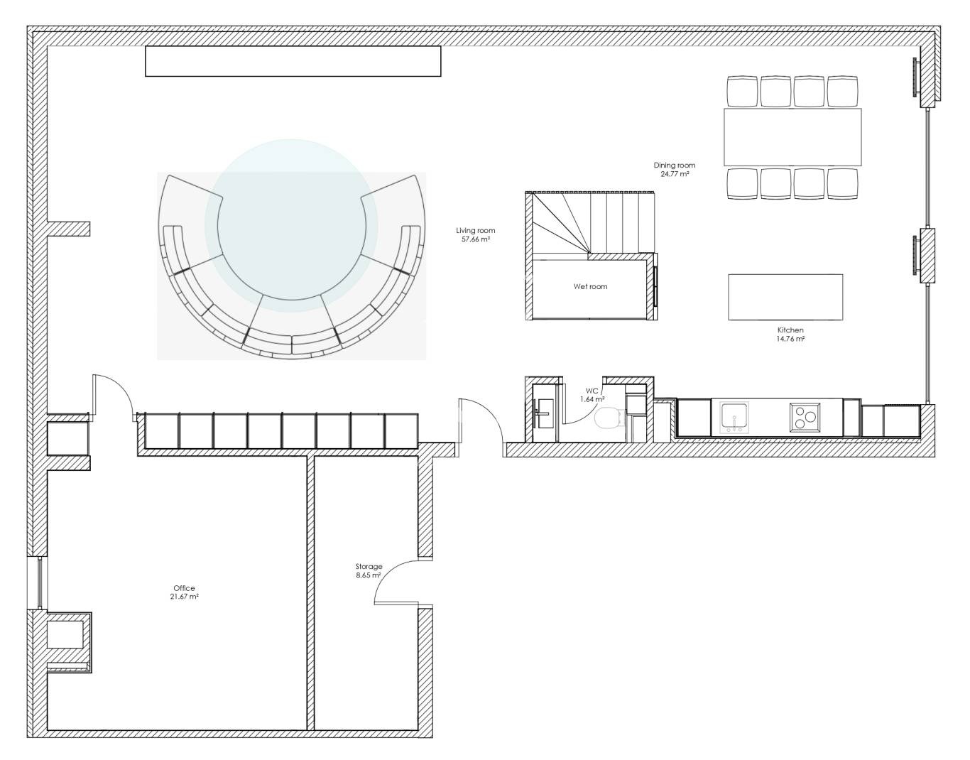 Първо ниво: дневна с кухня и трапезария, кабинет, тоалетна за гости, мокро помещение, склад, двор.