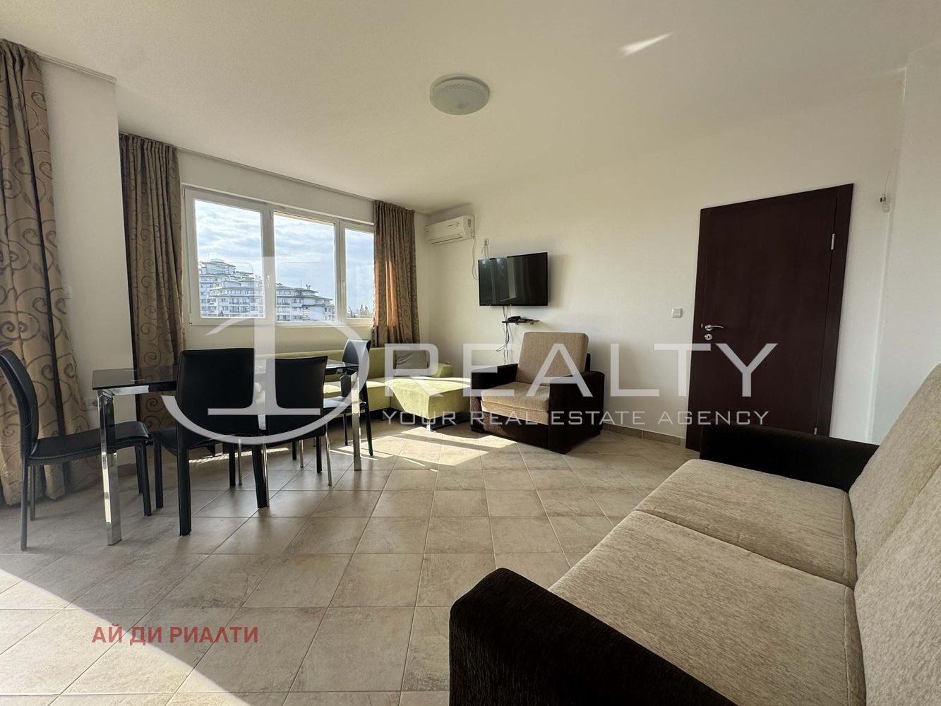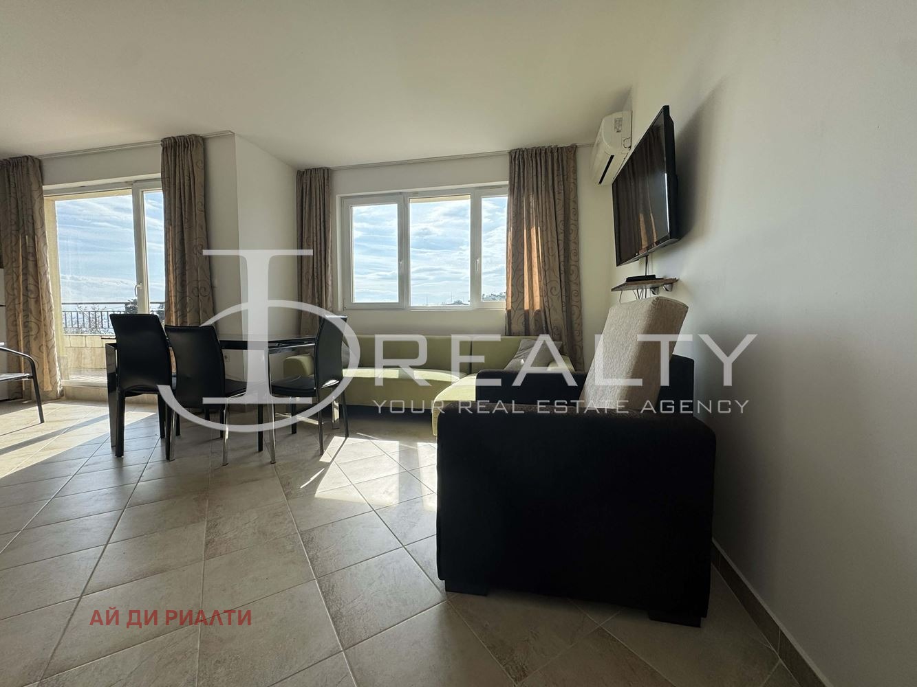 ID Realty има удоволствието да Ви представи просторен двустаен апартамент в с. Равда. Апартаментът се състои от всекидневна с кухненски кът, спалня със собствена гардеробна, баня с тоалетна и тераса. Гледка море от всяка стая. Издава се с наличните мебели и техника. Жилището се намира в сграда с АКТ 16 и асансьор. Подходящ е както за целогодишно живеене, така и с цел инвестиция за отдаване под наем.