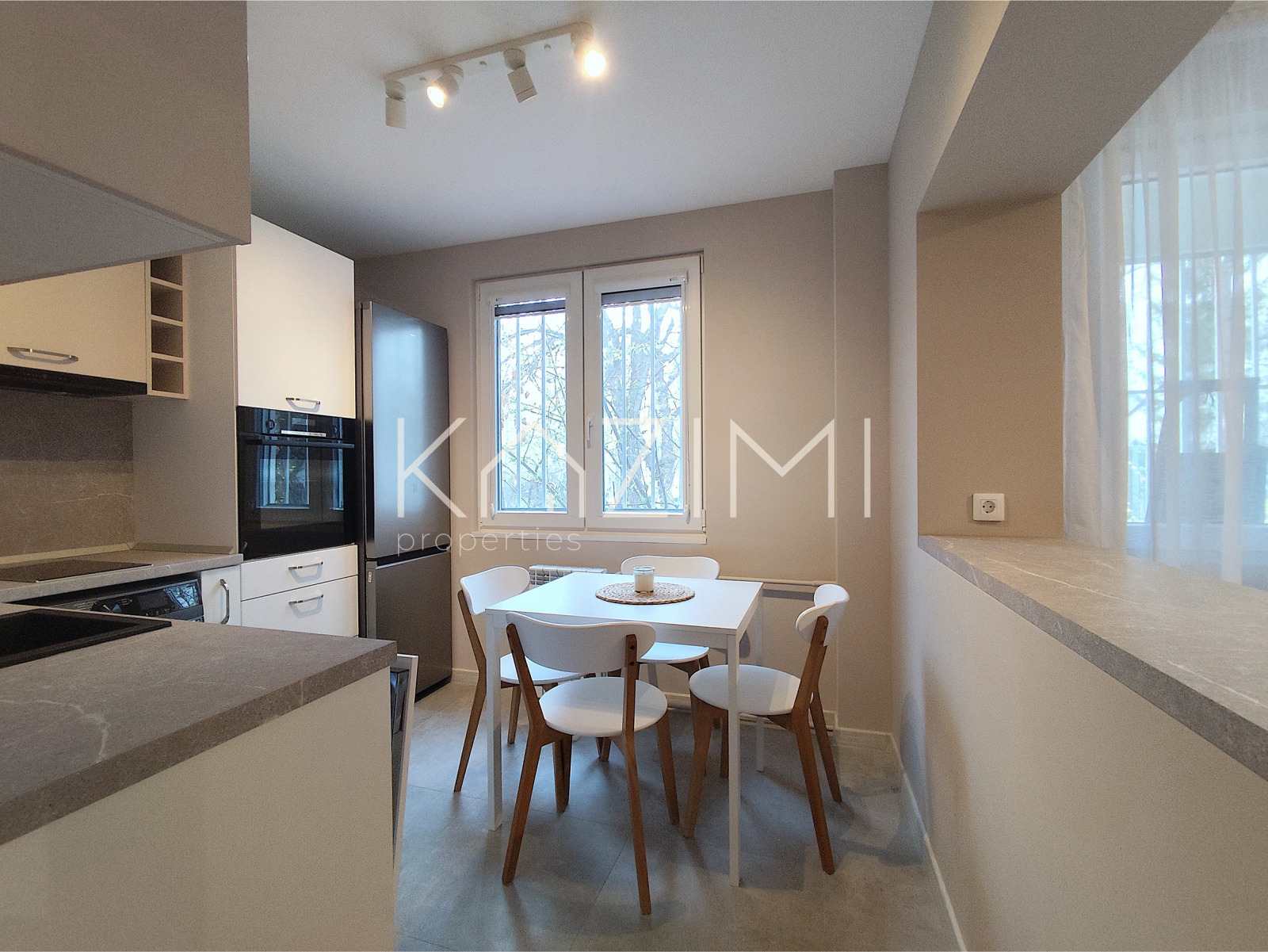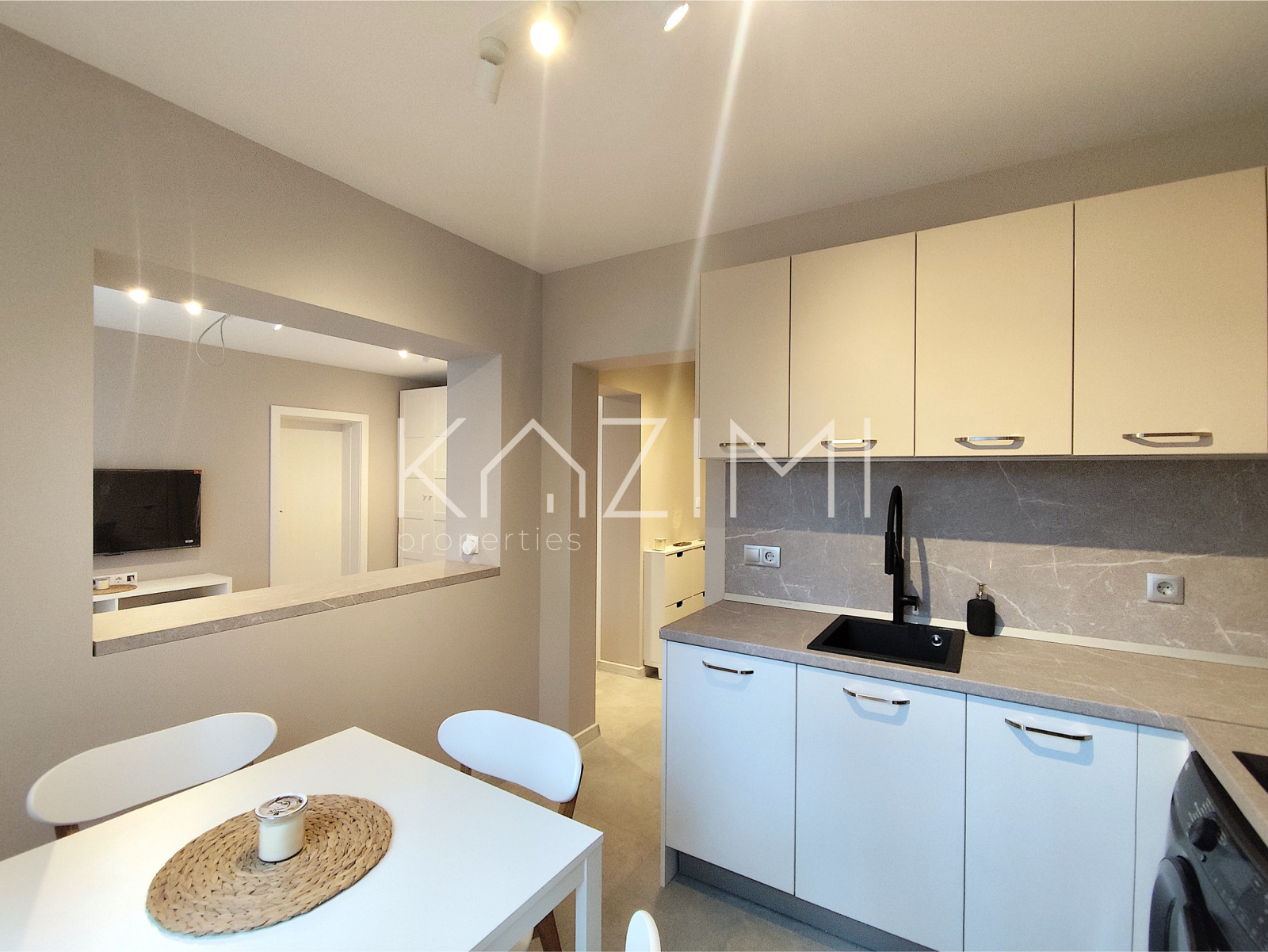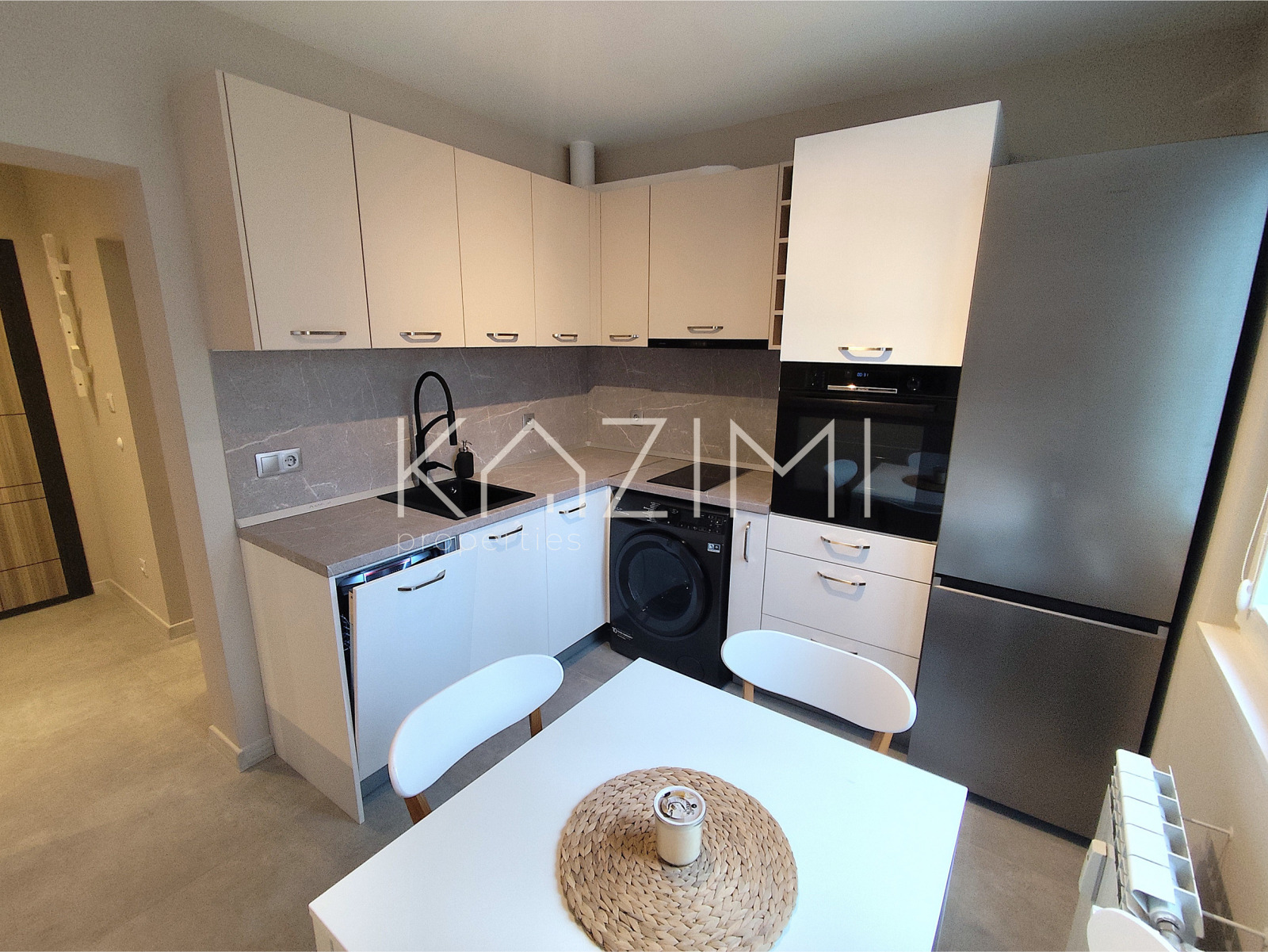 - кухня, оборудвана с всичко необходимо и висок клас уреди, включително миялна машина и комбинирана пералня със сушилня, отворено пространство, гледащо към дневната и телевизора