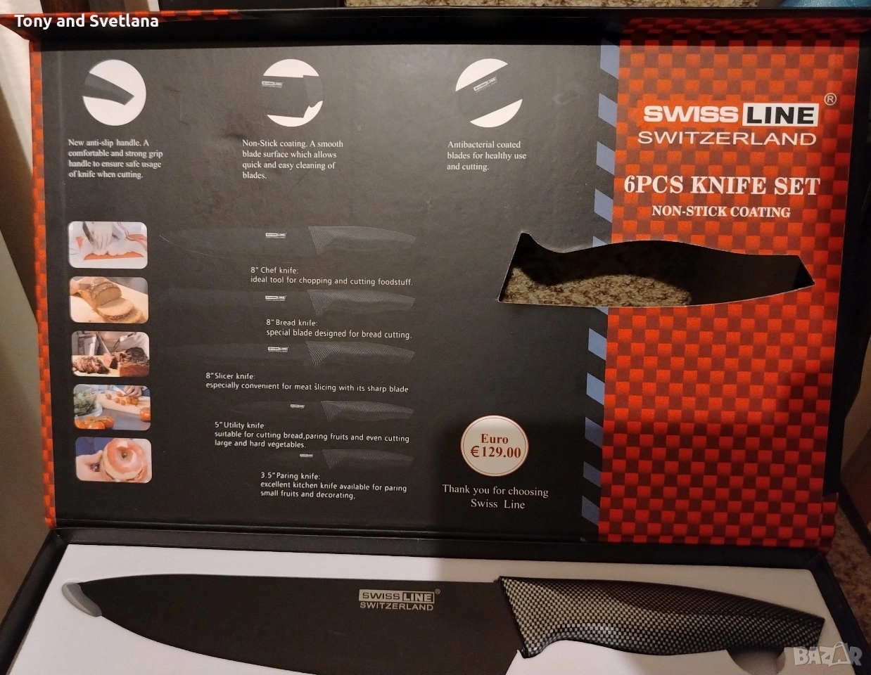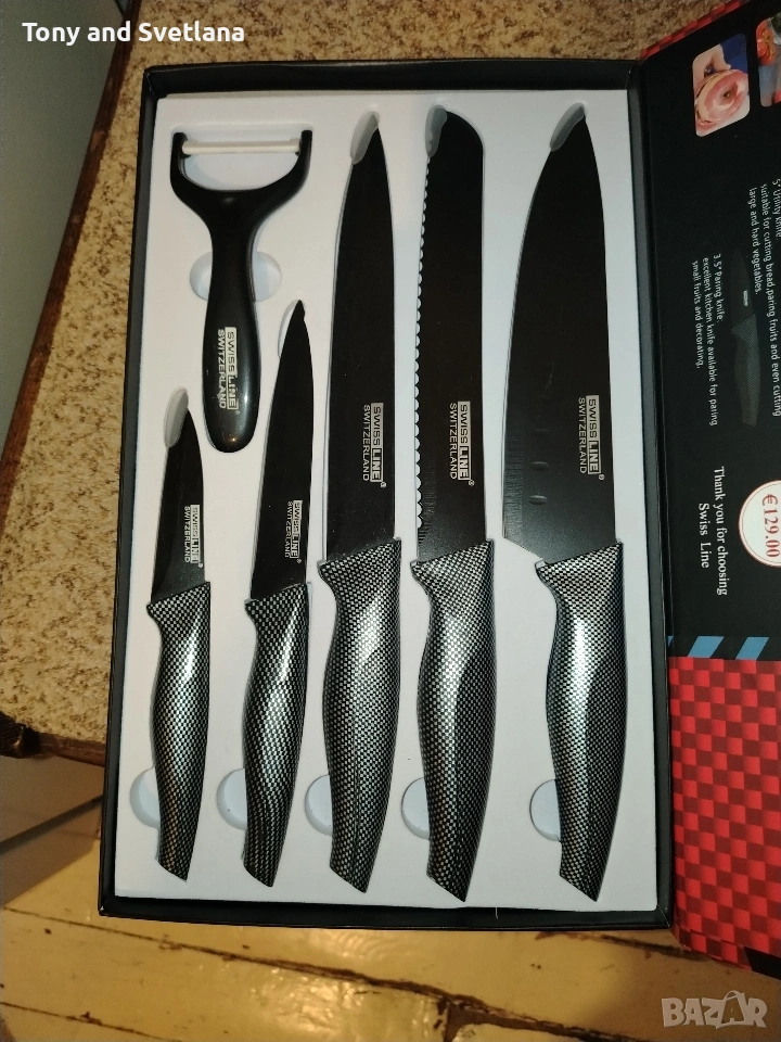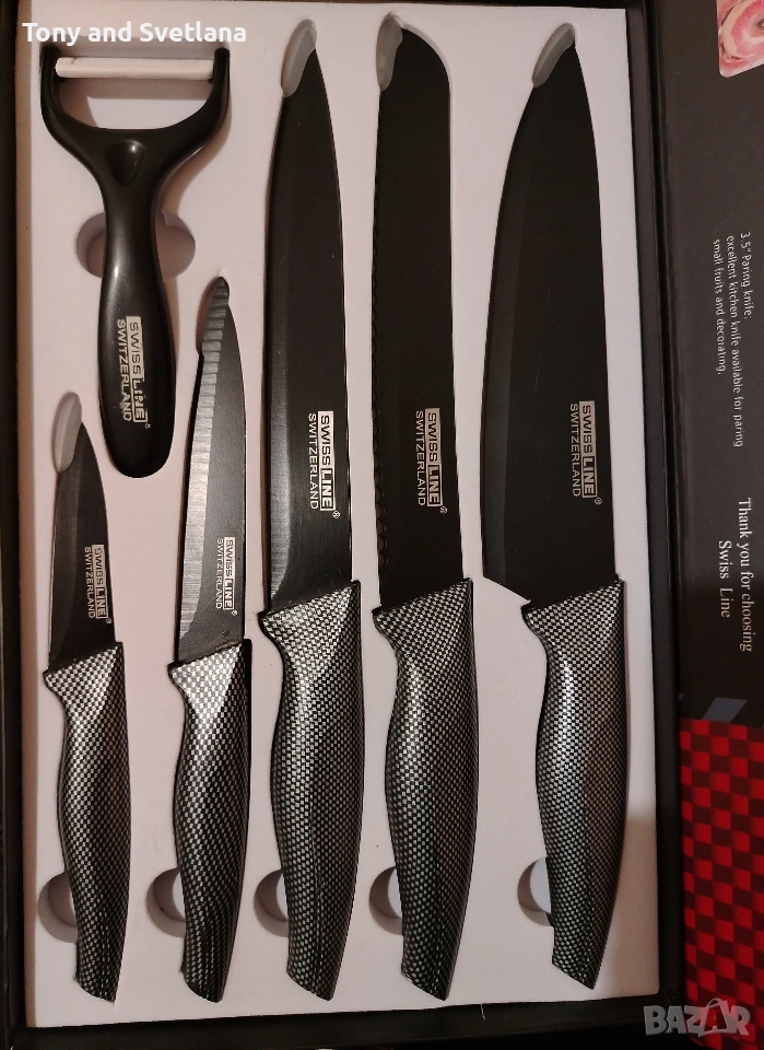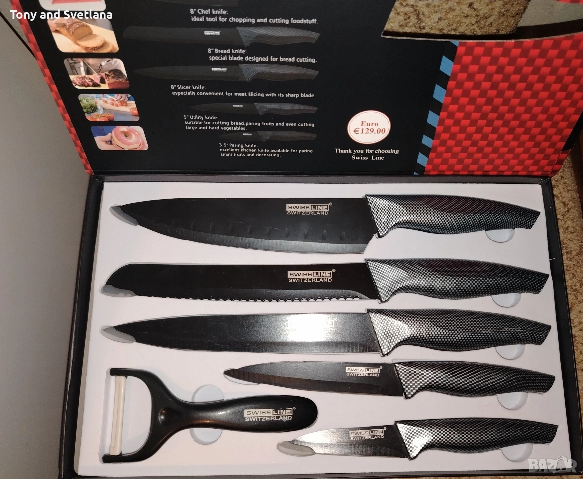 SWISSLINE SWITZERLAND комплект от пет кухненски ножа + керамична белачка → Обява 54066933