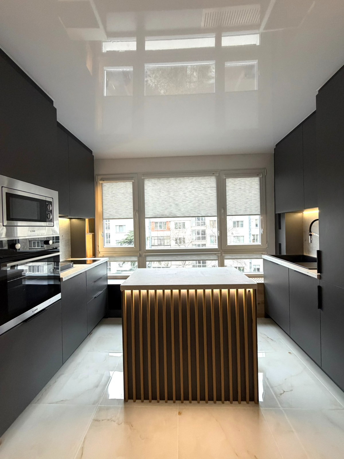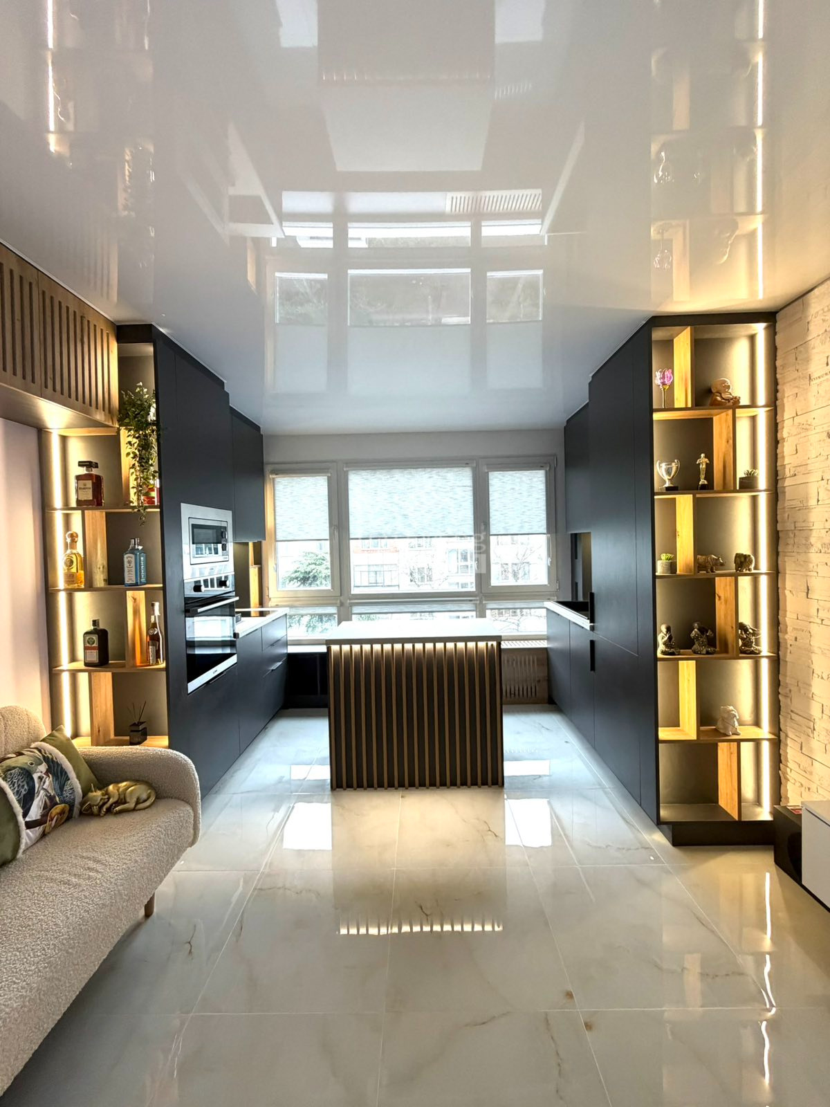 - дневна с кухненски бокс - дизайнерско обзавеждане с всички необходими кухненски уреди и функционални мебели, телевизор, кухненски остров, окачен опънат таван;
