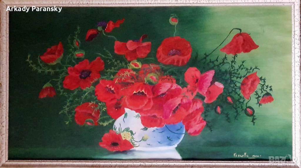 Автор Пецова. Натюрморт с макове. 1960. Картон. Гваш. 50х92см. (Рамка, стъкло).