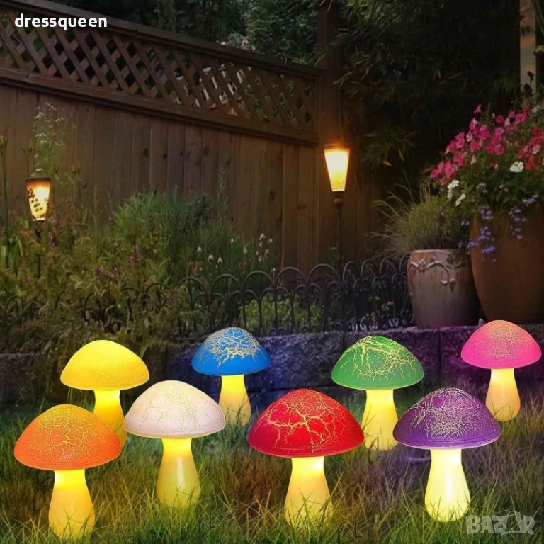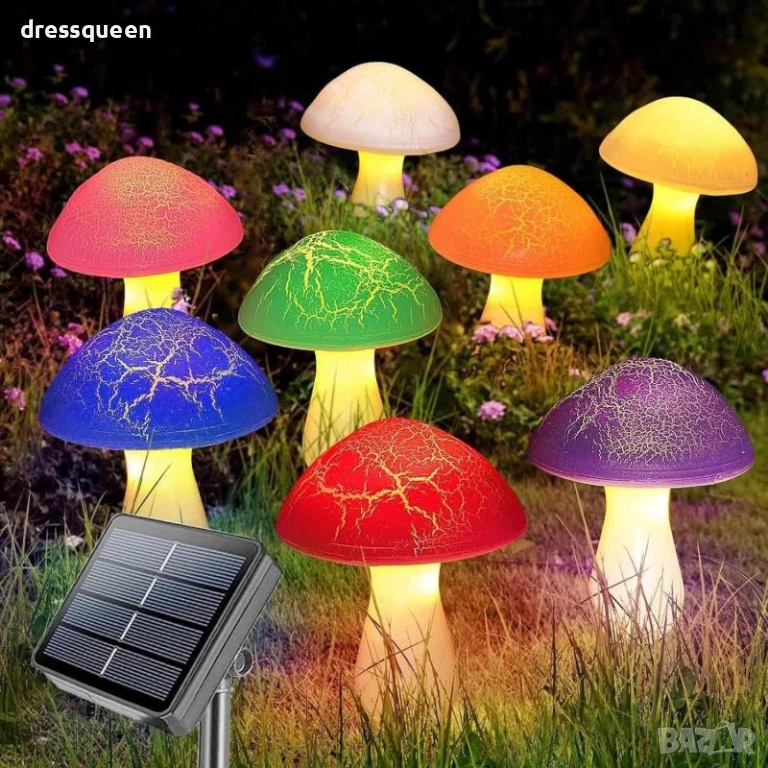 Комплект 8 броя Соларни Градински Гъбки с 8 Режима на Светене и Сензор за Здрач