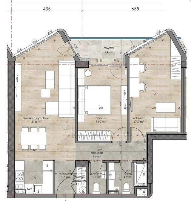 Разпределение: входно антре, кухненски бокс с хол и трапезария, спалня, кабинет, баня с тоалетна и тераса