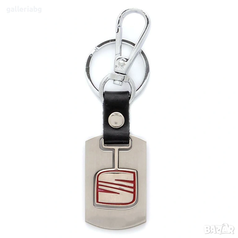 Стилен автомобилен ключодържател с дизайн Seat, комбиниращ метал и кожена дръжка за по-луксозна визия.