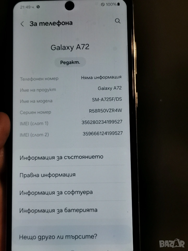 Телефон Samsung Galaxy A72, в отлично състояние, работи перфектно, батерията държи.