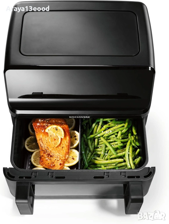 Общият капацитет от 9 литра позволява приготвянето на големи порции – до 8 порции пържени картофи или цяла пица с диаметър до 26 см. Благодарение на разделителя, камерата може да се превърне в две независими зони по 4.5 литра всяка.