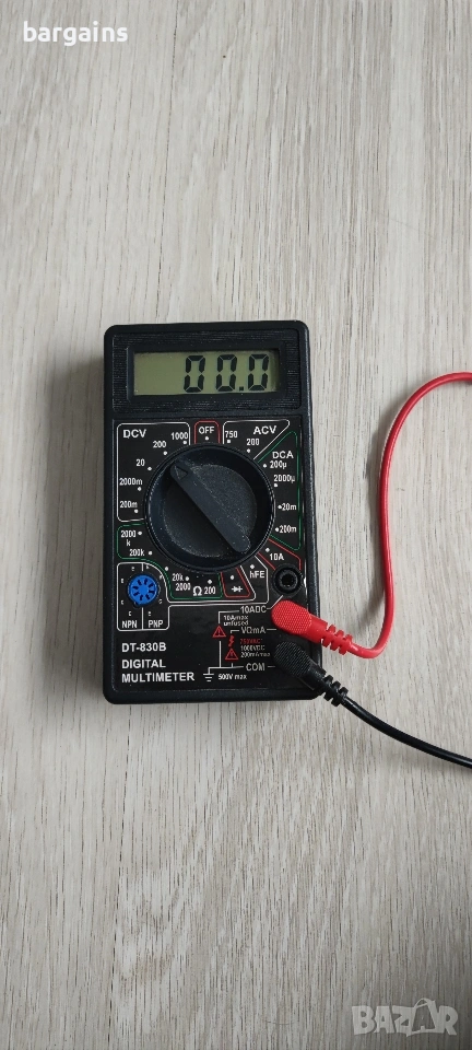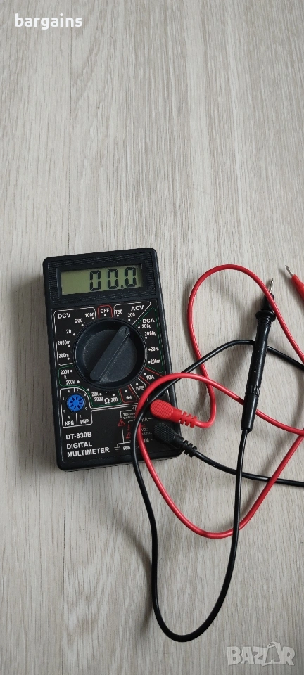 Напълно функциониращ мултицет с работеща 9 волтова батерия.