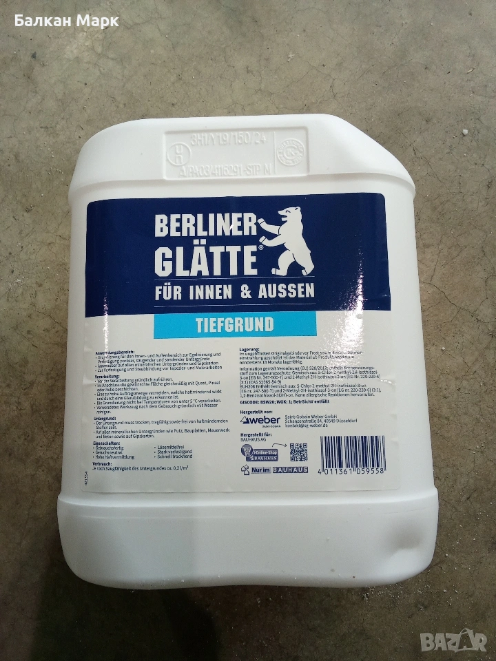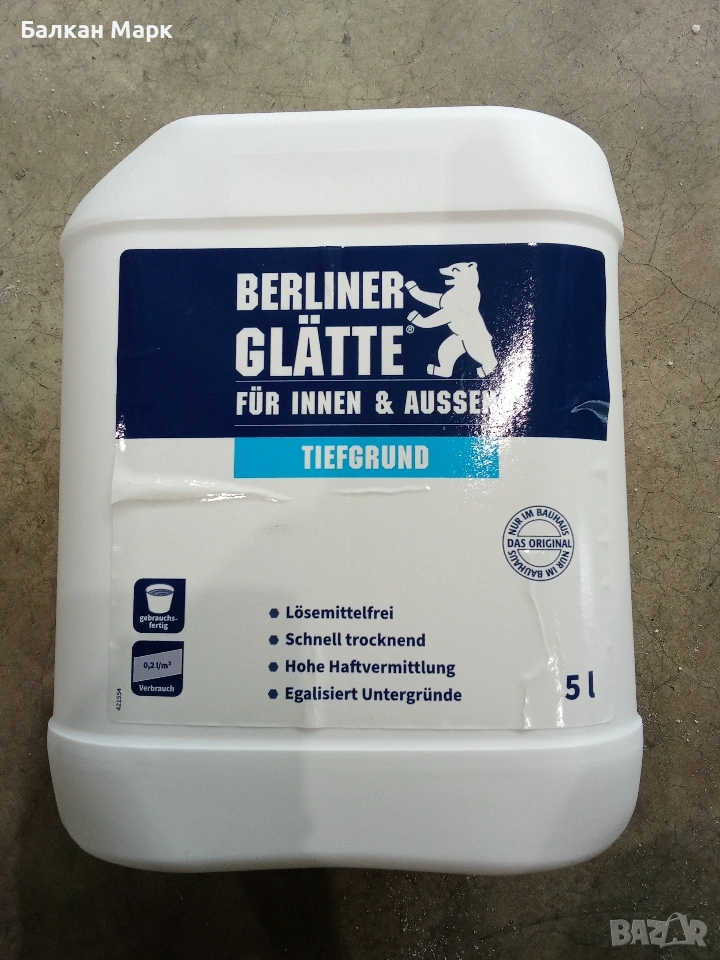 Продавам 1 брой висококачествен немски грунд Berliner Glätte, внос от Германия (част от палетирана стока). Продуктът е готов за употреба и идеален за подготовка на повърхности преди боядисване или лепене на тапети.
