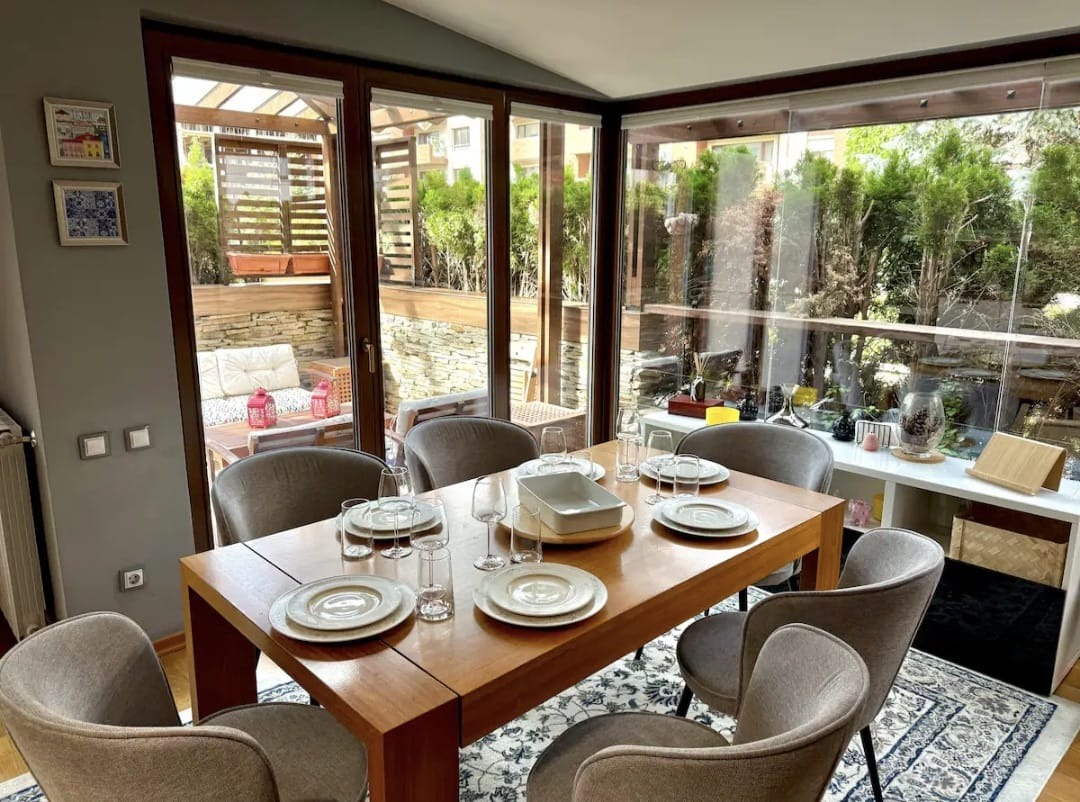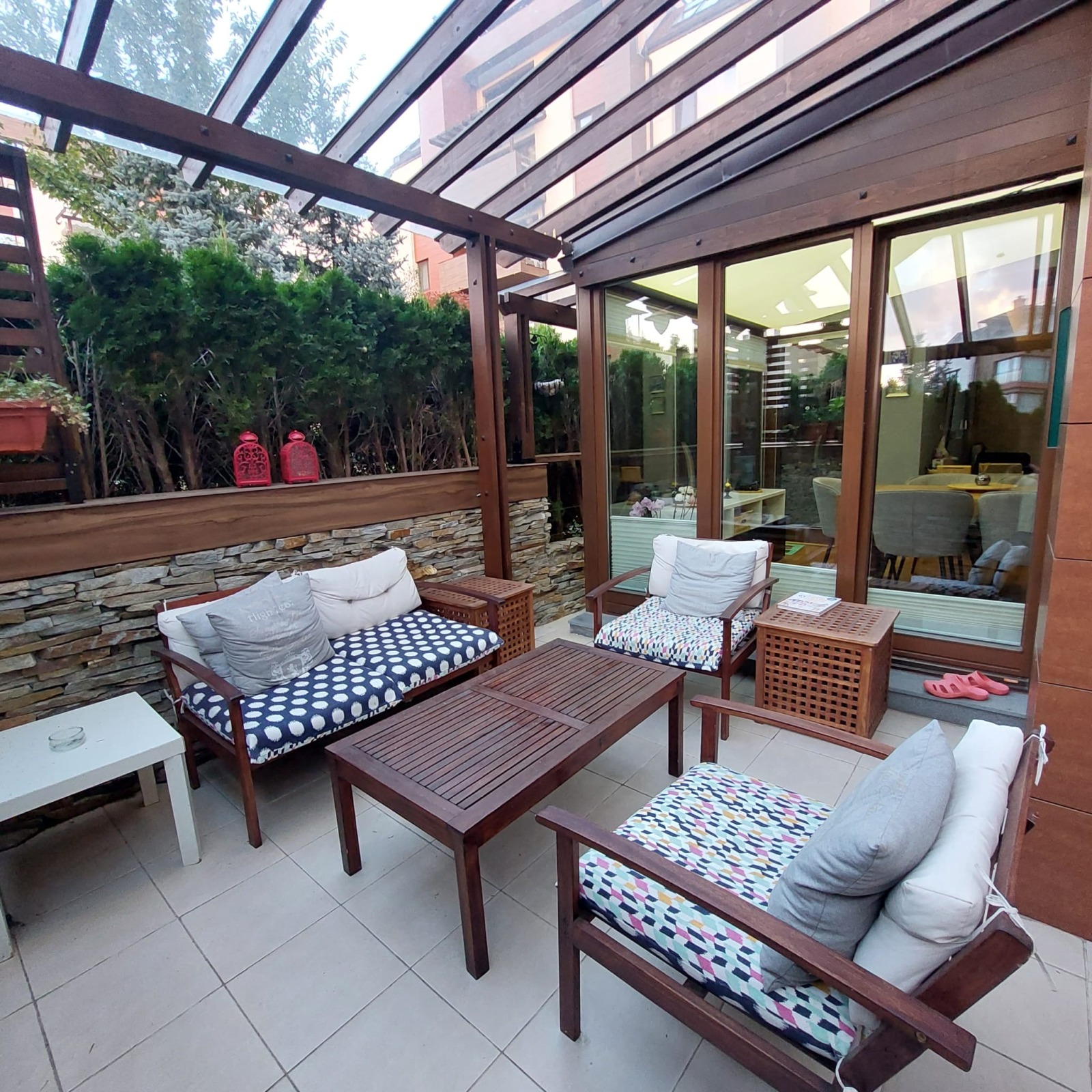 Намира се на ниво партер и 1-ви ет., със собствен двор и отделна тераса.