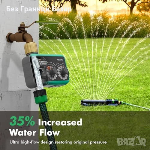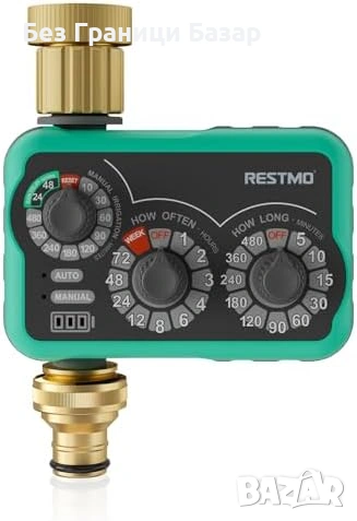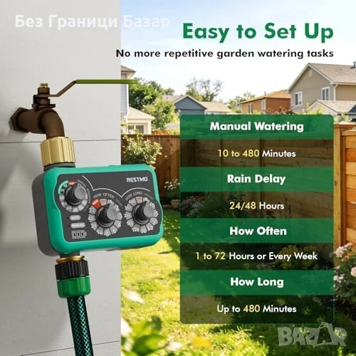 Работи с 2 x AA батерии и е удобен за градини, тревни площи и капково напояване